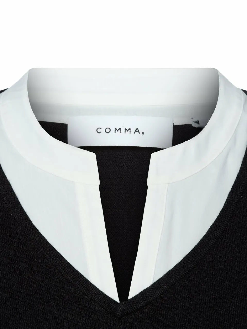 Müheloser Allrounder für casual smarte Looks: Der Feinstrickpullover von comma zeigt sich im 2-in-1 Design mit kontrastfarbigen Einsätzen am Ausschnitt und Saum.