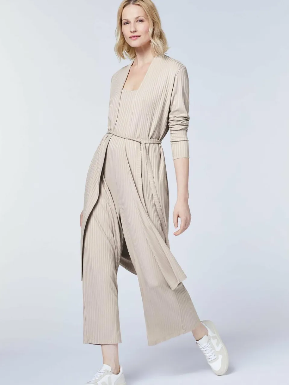 Yoga-Style zum Wohlfühlen: Der softe DETTO FATTO Damen-Einteiler zeigt sich im Basic-Ripp-Design. Auf Taillenhöhe wird die lockere, fließende 7/8-Silhouette von einem Stoffgürtel mit Schleife akzentuiert. Cradle to Cradle Certified® SILVER steht für Transparenz. Der DETTO FATTO Jumpsuit aus der „Yoga by Caro Cult“ Kollektion zelebriert nonchalant zertifizierte Mode mit Athleisure-Appeal. Verfolge die Produktionskette mit der MADE IN GREEN by OEKO-TEX® Produkt-ID: M24LMVXG3.
