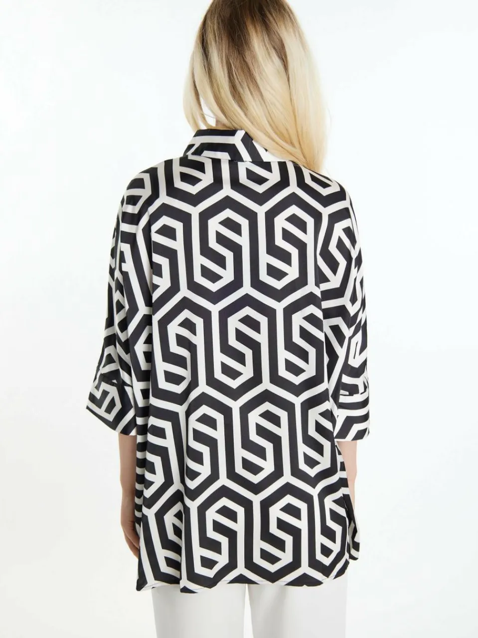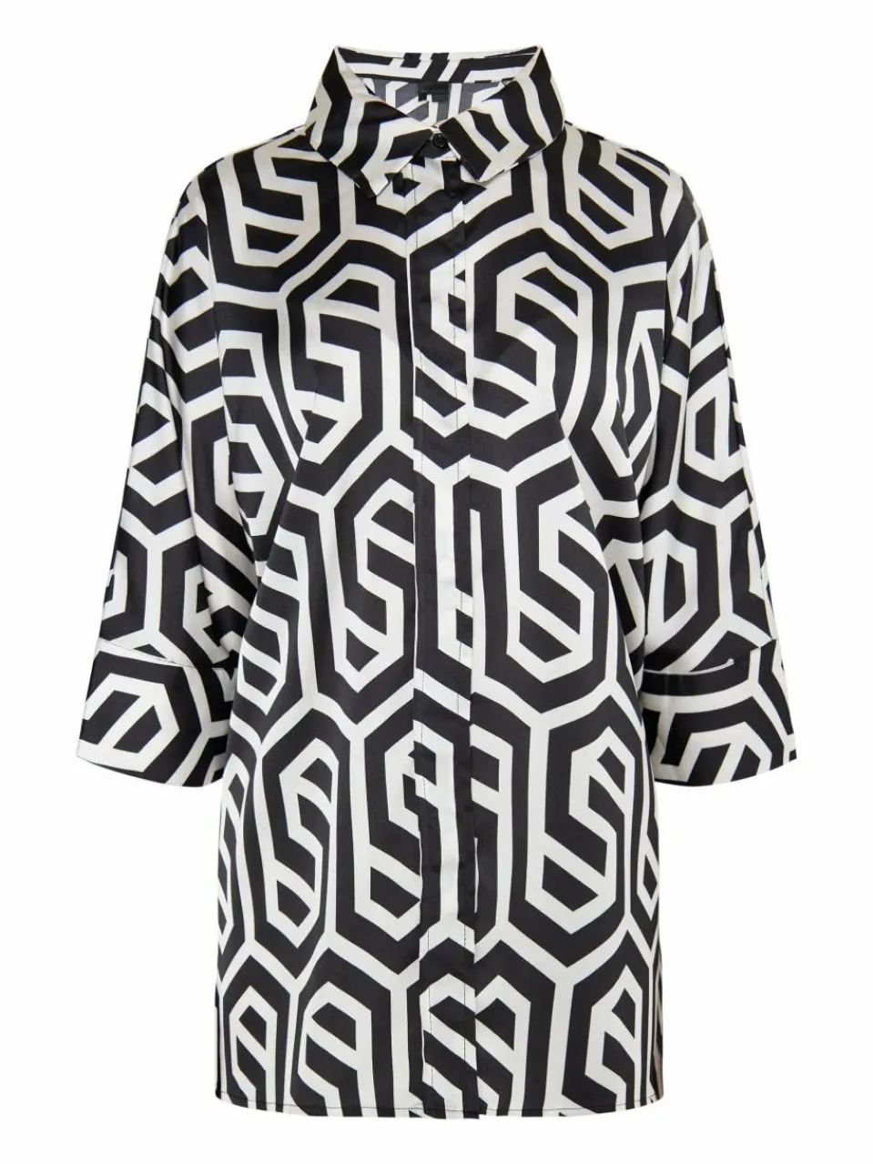 Ein seidig-glänzender und fließender Stoff macht diese Bluse von DreiMaster Klassik zum 9 to 5 Lieblingsoutfit. Der großflächige geometrische Print und der klassische Hemdblusen-Stil vereinen sich wunderbar und präsentieren einen modernen contemporary Look.