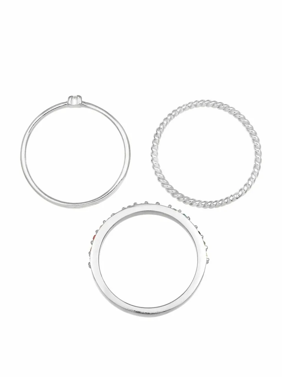 Ein einzigartiges Ring-Set für Frauen mit farbenfrohen Kristallen. Drei Ringe kombiniert in einem Schmuckstück, das sommerliche Leichtigkeit versprüht. Der funkelnde Solitärring mit einem leuchtenden Kristall , der moderne gedrehte Ring und der filigrane Bandring im Mult-Color Design, bestechen durch ihre schlichte Eleganz. Die Ringe lassen sich sowohl einzeln als auch in Kombination miteinander oder mit auffälligem Statement-Schmuck tragen und sorgen für strahlende Momente.