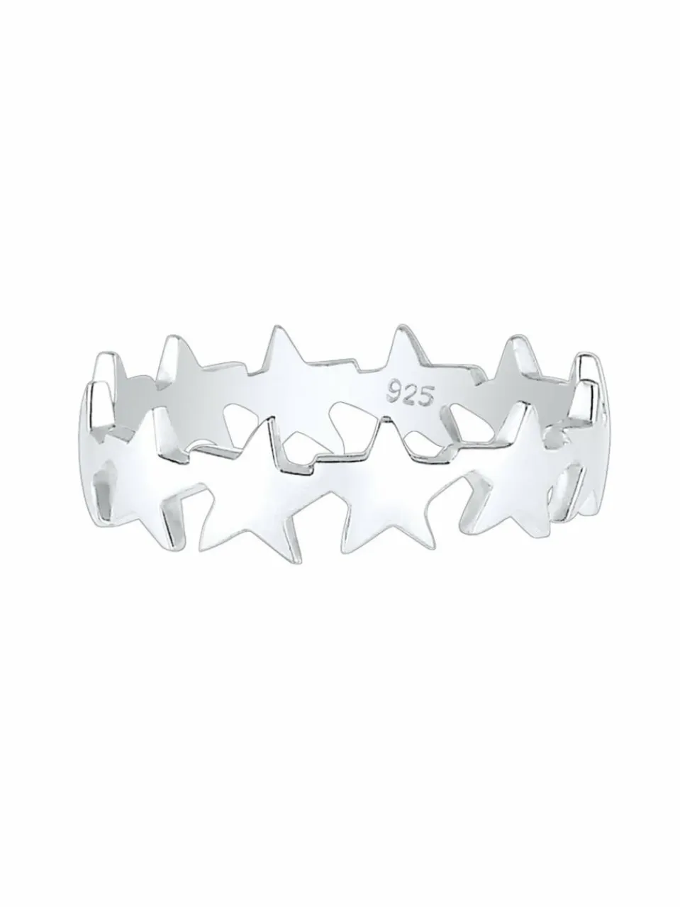 Sei der Star! Dieser coole Silberring besticht durch die aneinandergereihten Sterne. Das beliebte Schmuckstück lässt sich optimal zu vielen Stilrichtungen kombinieren. Ob Schick oder sportlich, dieses verspielte Accessoire begeistert durch seinen Astro Look.