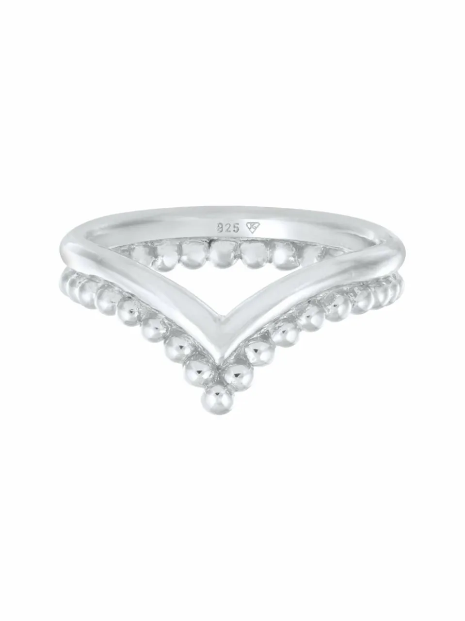 Dieser kreative Damen Ring, begeistert durch seine moderne V-Form. Die klare Linie dieses ausdrucksstarken Schmuckstücks wird durch Silberkugeln geziert. Ein beeindruckendes Statement-Schmuckstück das durch seinen dezenten und doch verspielten Look einen Hauch Glamour verleiht.