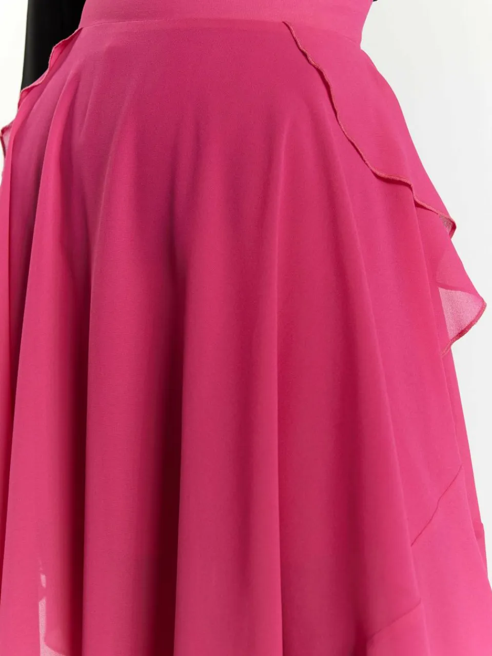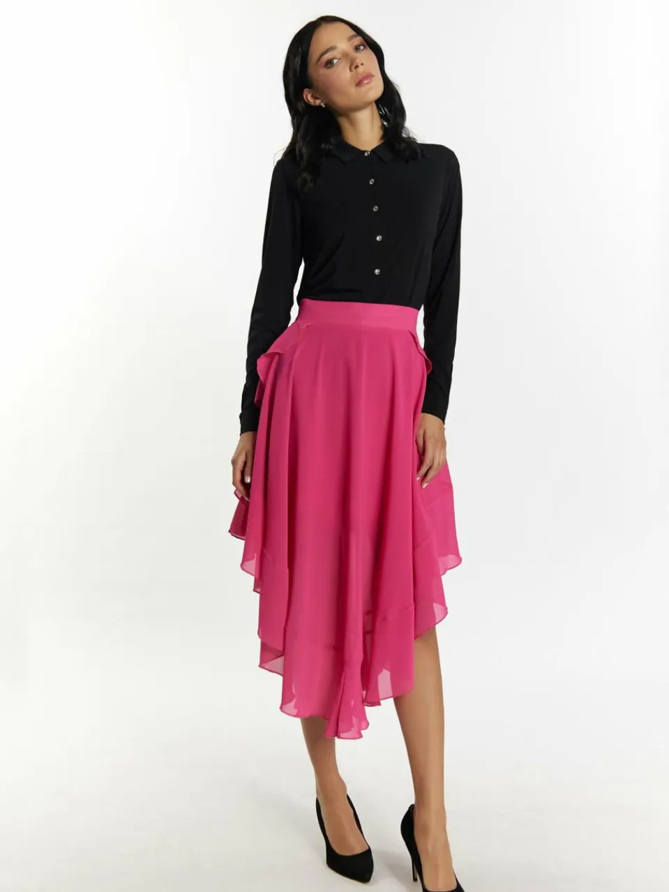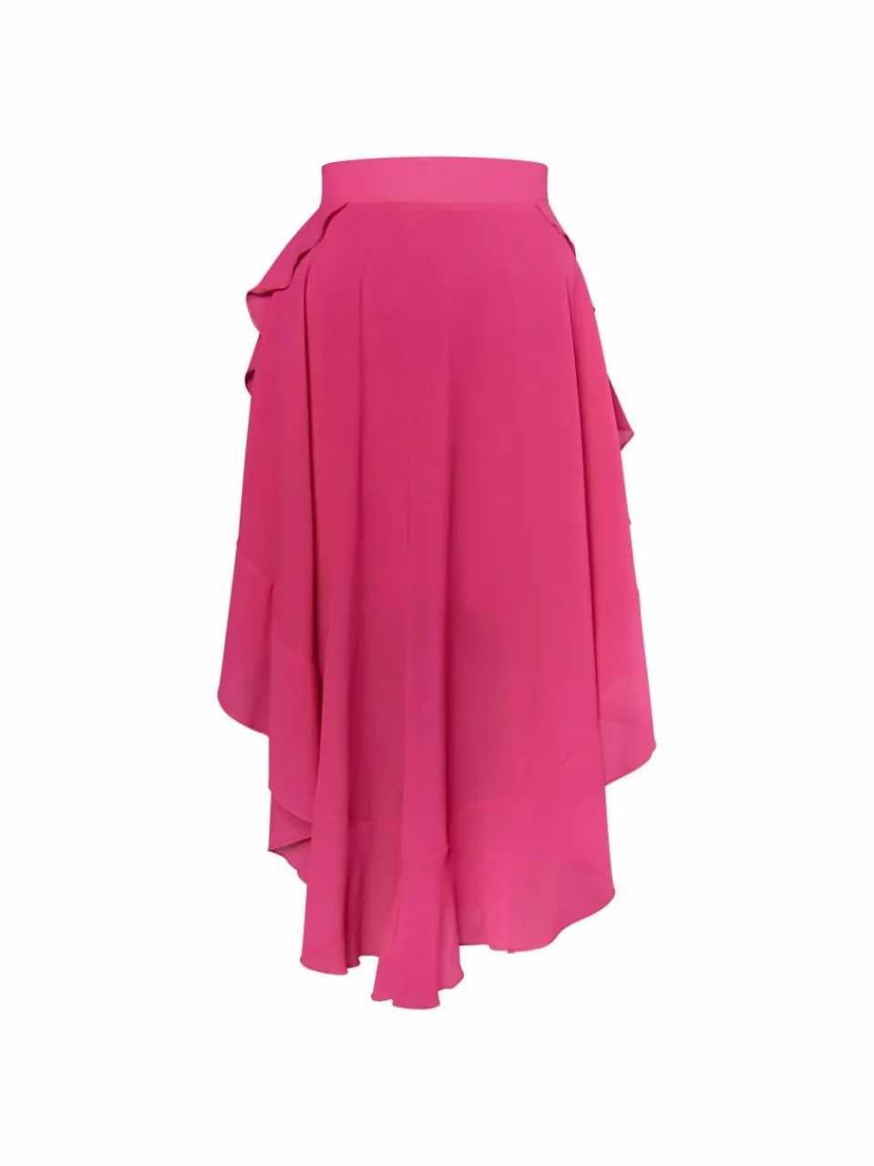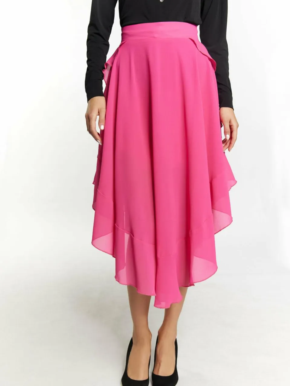Dieser High-Rise-Rock von faina wurde in Italien aus einem weich-fließenden Material gefertigt. Er besticht durch einen asymmetrischen Saum, der sich in gewellter Rüschenform präsentiert und an den Seiten deutlich kürzer ausfällt als auf der Vorder- und Rückseite. Der hohe Bund wird mit einem rückseitigen Reißverschluss geschlossen.