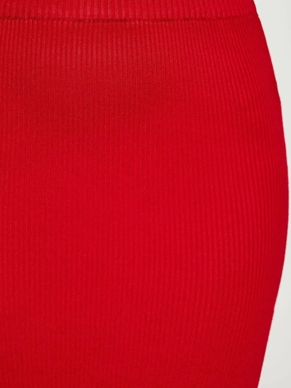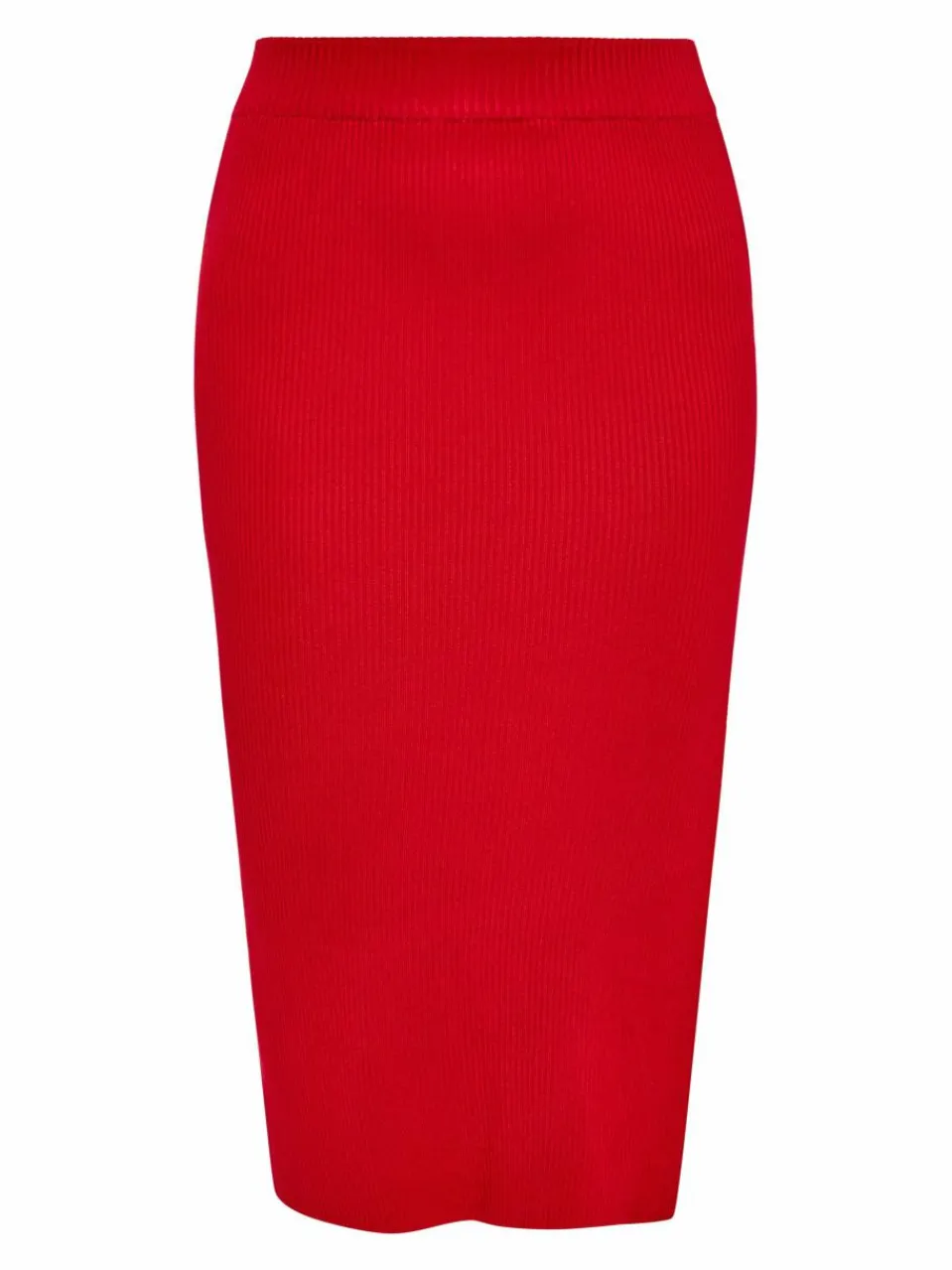 This ribbed knit midi skirt is a summer wardrobe essential. The fitted silhouette with an elasticated waistband ensures a comfortable and snug fit. Featuring a slit for added flair, this pull-on style contour skirt is designed to flatter your figure effortlessly. Perfect for everyday wear, the ribbed texture adds visual interest to this basic yet stylish piece. This product is a part of Classic Rib Collection