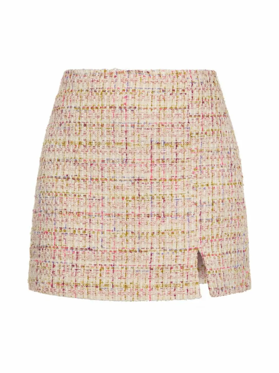 Introducing a chic boucle mini skirt, featuring a straight hemline and a side slit for ease of movement. The tweed-like texture with added golden thread adds depth to its appearance, while the structured form suggests quality construction. With an invisible zipper closure, this skirt offers a seamless look when worn, making it a perfect addition to your wardrobe. This product is a part of Boucle Collection