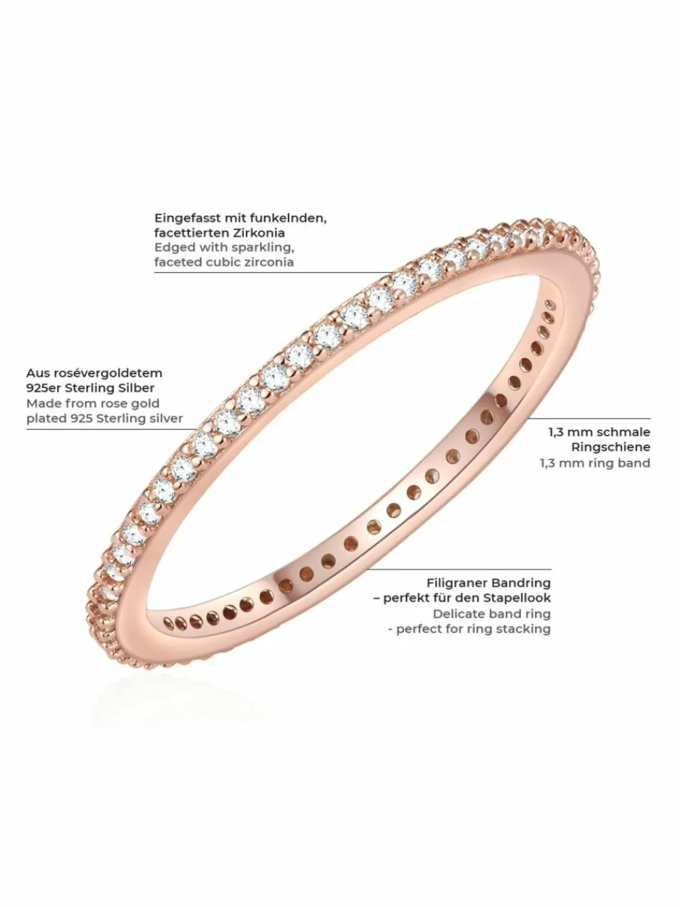 Dieser bezaubernde Ring des Labels Glanzstücke München wickelt dich garantiert um den Finger! Die schlichte Ringschiene ist nahtlos mit funkelnden Zirkoniasteinen besetzt und wird so zum Hingucker an deiner Hand. Die hochwertige Rosévergoldung sorgt für einen femininen Touch und warmen Glanz. Solo, als Vorsteckring oder gestapelt mit deinen Lieblingsringen: Der Ring bereichert jede Schmuckschatulle, ist vielseitig tragbar und ein tolles Geschenk für Fashionistas.