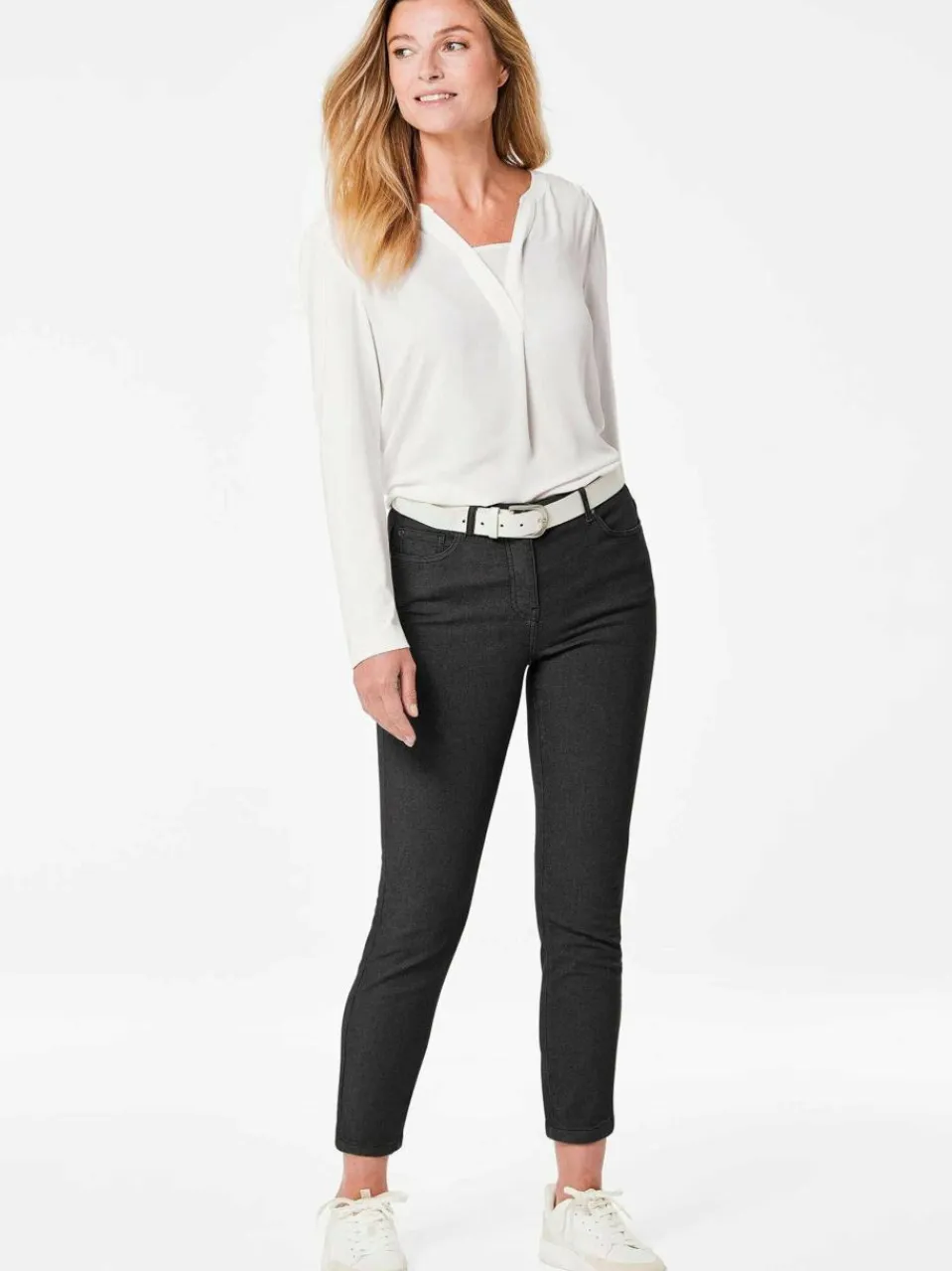 - Schmaler Stil mit vorteilhafter Silhouette, 5-Pocket-Form mit Gürtelschlaufen