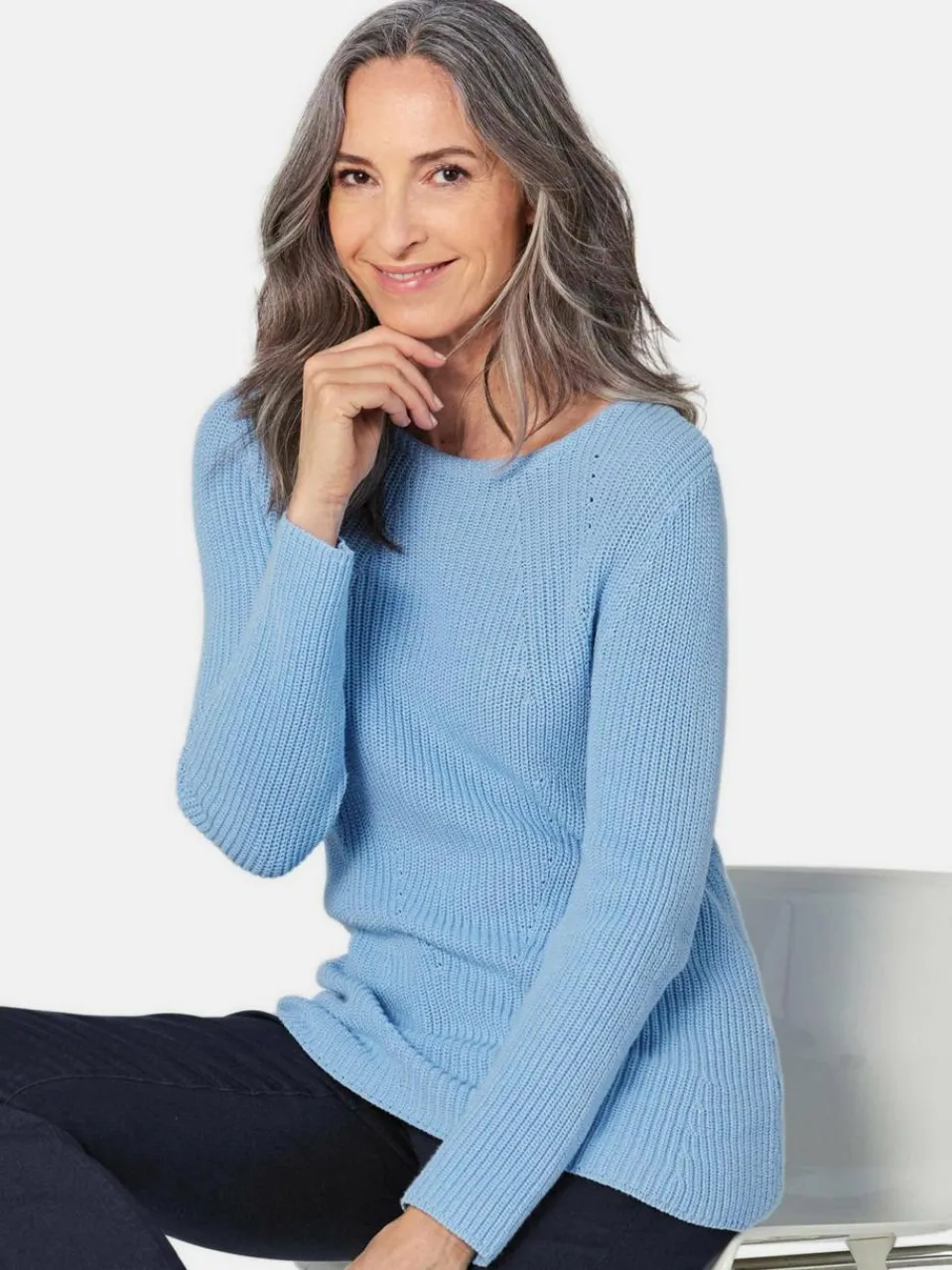 Pullover mit einer raffinierten Linienführung im Vorderteil – sie zaubert eine wunderschöne, feminine Silhouette. Der Patentgrobstrick und ein bezaubernder, moderner U-Boot-Ausschnitt verleihen dem außergewöhnlichen Modell eine tolle Optik. In einer formstabilen, trageangenehmen Qualität aus reiner Baumwolle. Sie sorgt für ein erstklassiges Tragegefühl. Der Pulli ist in Form gestrickt und garantiert somit perfekte Passform. Länge ca. 67 cm in Gr. 46, ca. 63 cm in Gr. 23.