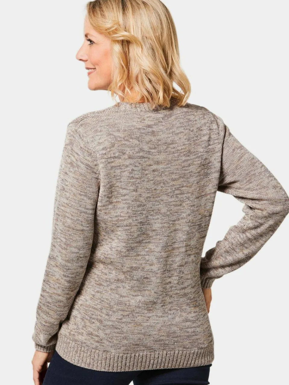 Pullover mit edlem metallisierten Garn in einer ausdrucksstarken Melangeoptik. Schmückende Ajour-Elemente im Vorderteil. Toller Tragekomfort durch hohen Baumwollanteil. In Form gestrickt mit Rundhalsausschnitt und Rippabschlüssen. Länge ca. 67 cm in Gr. 46, ca. 63 cm in Gr. 23. Unser Model ist 172 cm groß und trägt Größe 38