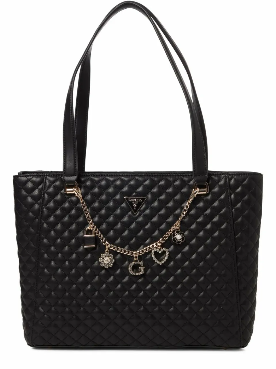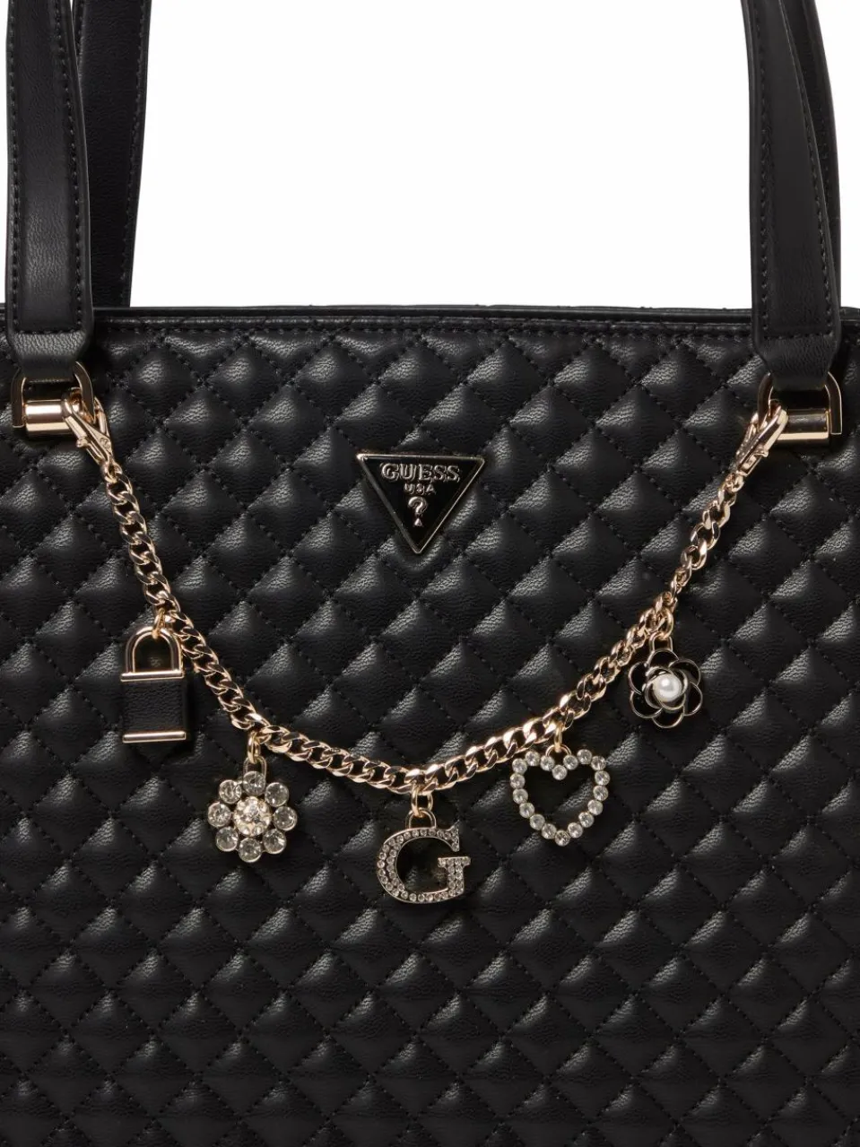 Im raffinierten Design aus gestepptem Kunstleder mit Zier-Gliederkette und funkelnden Anhängern begeistert die Guess Tasche Everlee als Highlight-Accessoire.