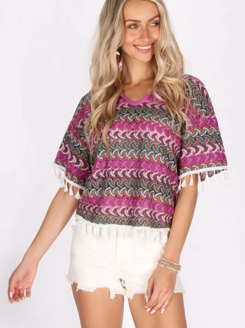 Introducing a stylish Geometric Pattern Summer Top for women, featuring a V-neckline with contrasting trim and decorative tape details along the hem and sleeve edges. The three-quarter length sleeves add a touch of boho vibe to this knit multicolor top, while the wavy textured pattern throughout exudes a casual bohemian vibe.