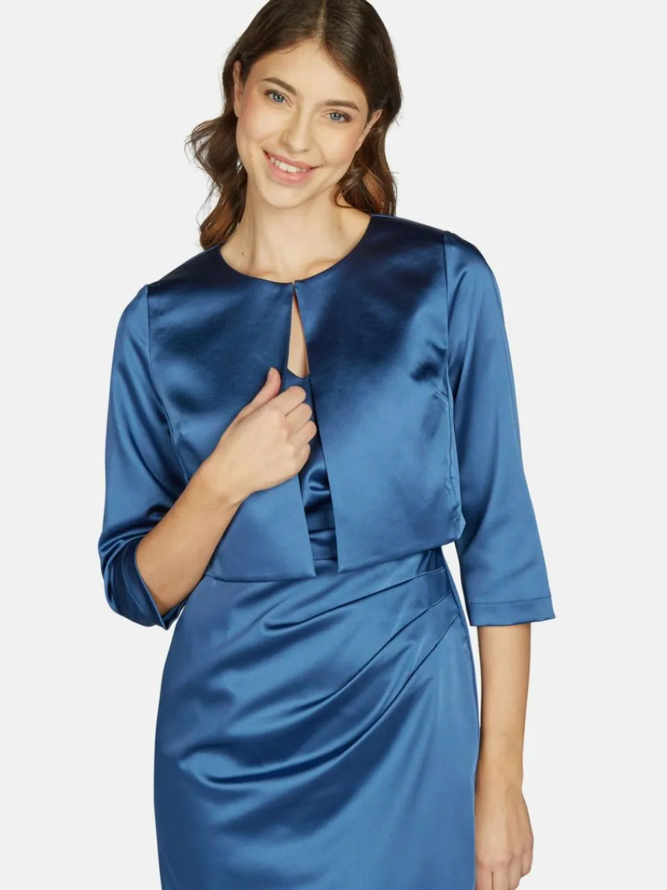 Der KLEO Bolero ist zeitlos und wertet die Garderobe auf. Das Modell aus edel schimmerndem Satin kommt mit 3/4-Arm und Verschlusshaken und ist der perfekte Begleiter für jede Gelegenheit.