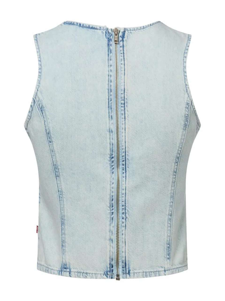Das Levi’s Blusentop aus gebleachtem Denim mit markanten Nähten und durchgehendem Reißverschluss am Rücken verleiht dem Look mühelos ein edgy Finish.