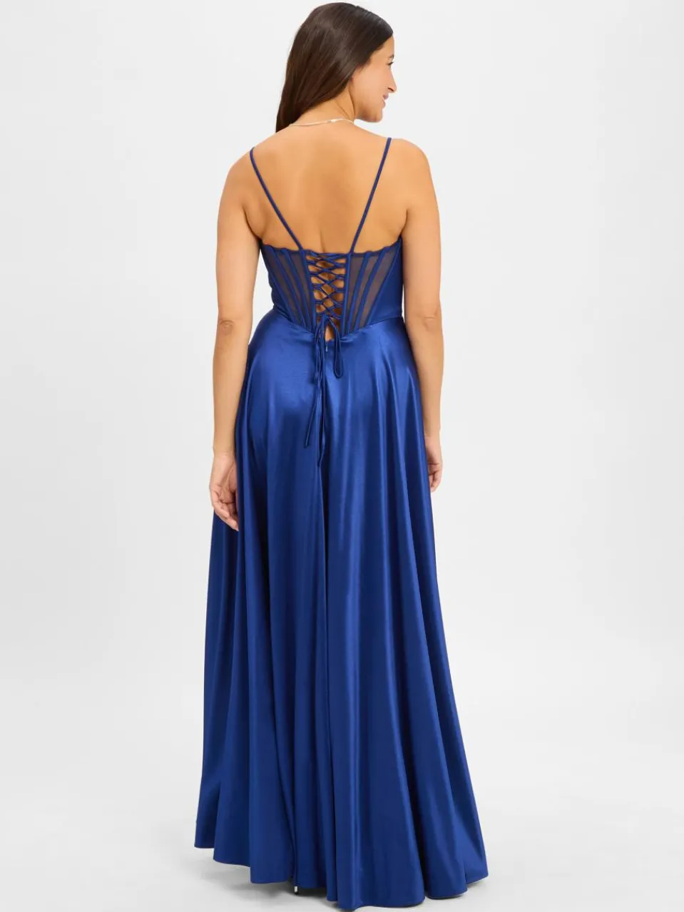 Raffiniertes Abendkleid von Luxuar Fashion aus fließendem Satin mit Corsagen-Top, ergänzt durch feine Mesh-Einsätze vorn und eine rückseitige Schnürung in eleganter A-Linie für eine feminine Silhouette.