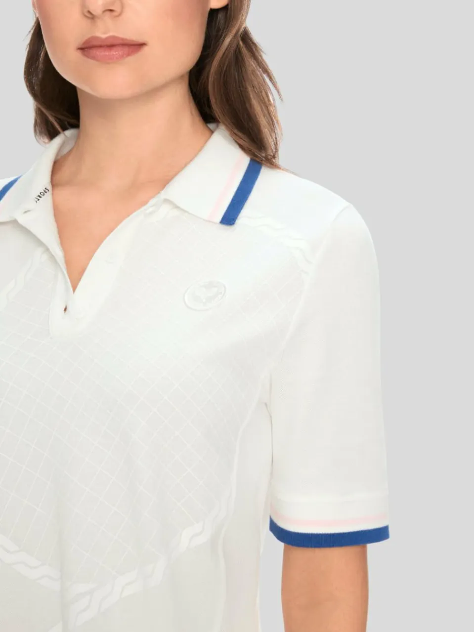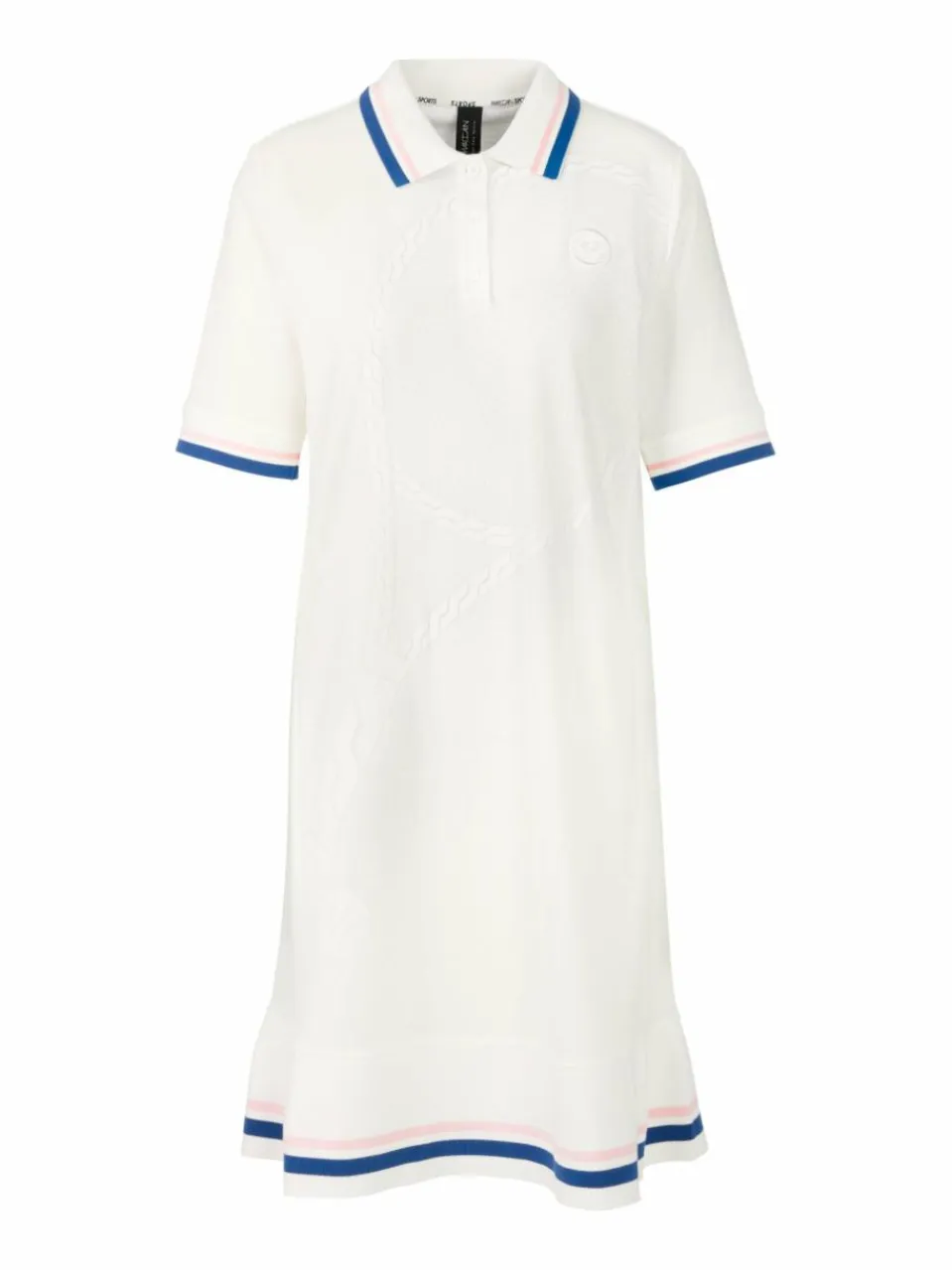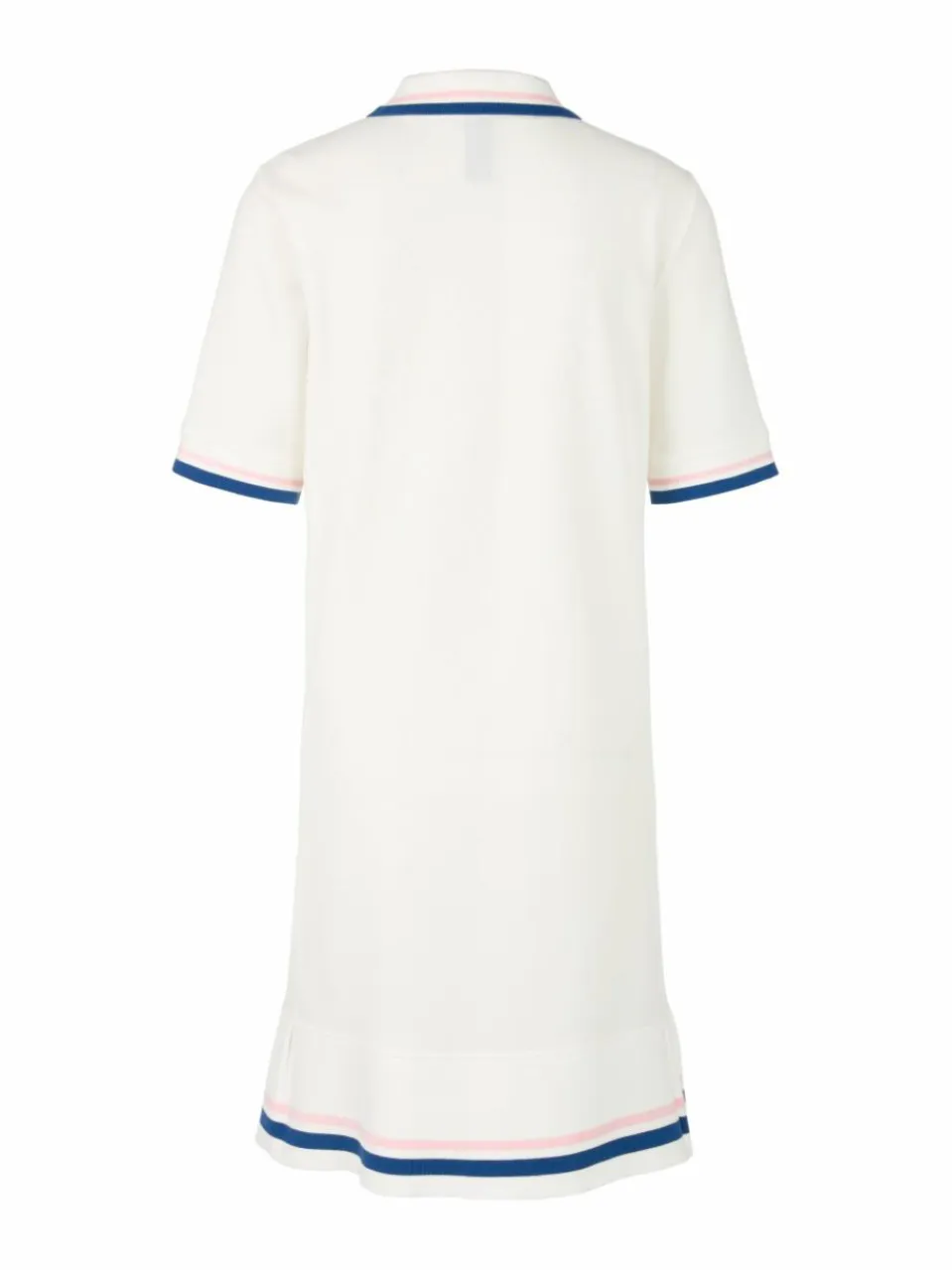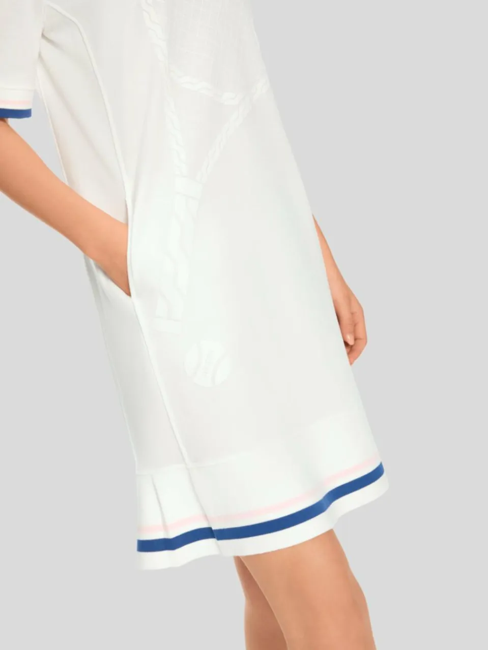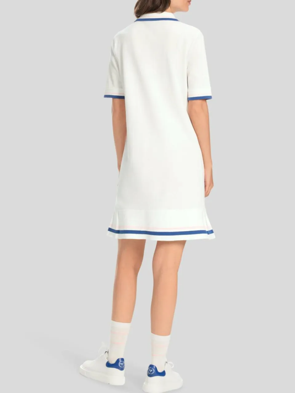 Das Kleid ist aus reiner Baumwolle gefertigt, präsentiert sich in A-Linie und spiegelt den Lifestyle der Tennisclubs wider. Durch die kleinen Falten an den Seiten ergibt sich ein leicht schwingender Saum. Die Vorderseite ziert ein überdimensionierter Tennis-Schläger und das neue Tennis-Signet in Form einer Applikation. Besondere Akzente setzen Kontrastringel und der gestrickte Polokragen sowie gestrickte Ärmelbündchen.
