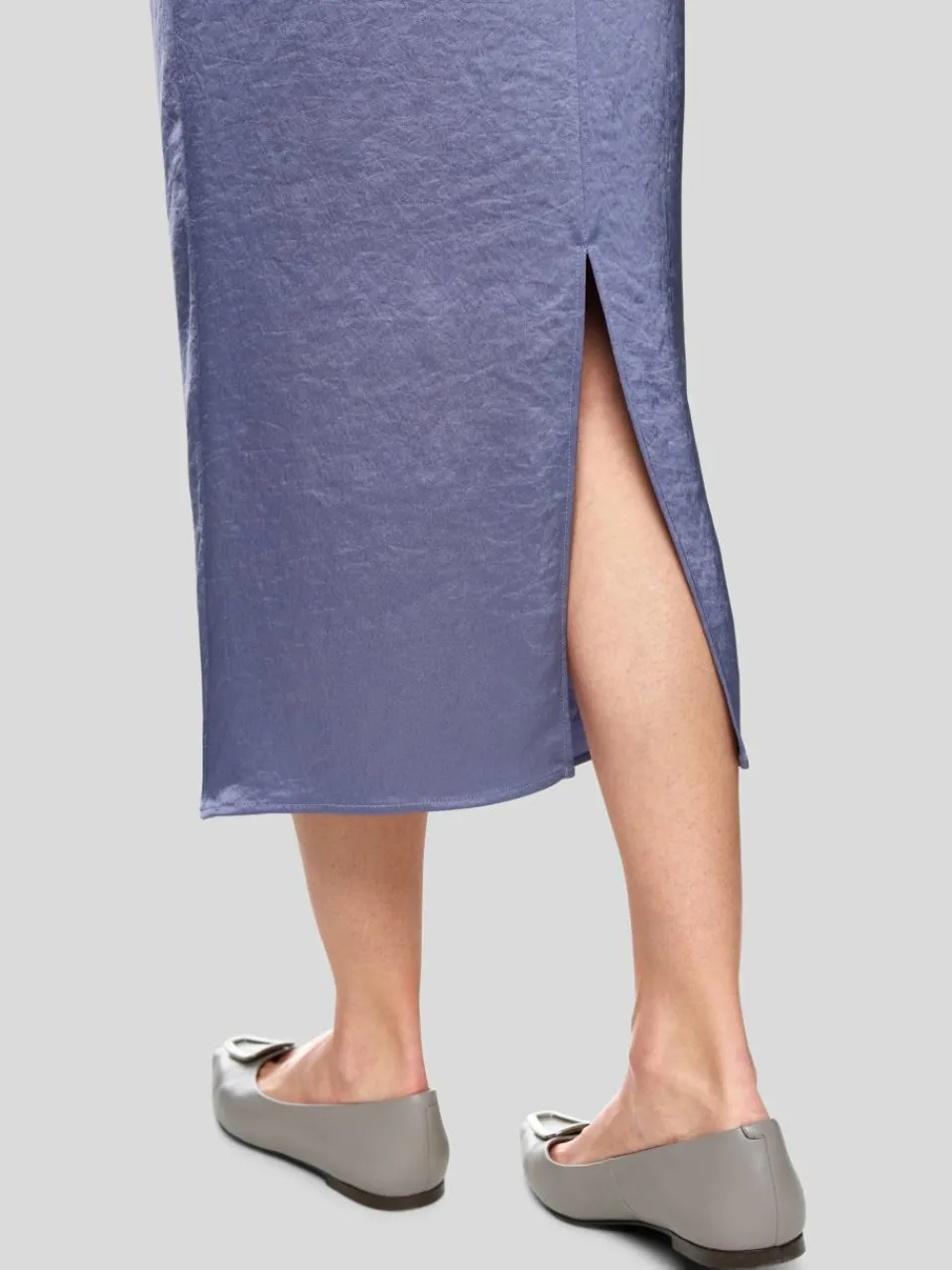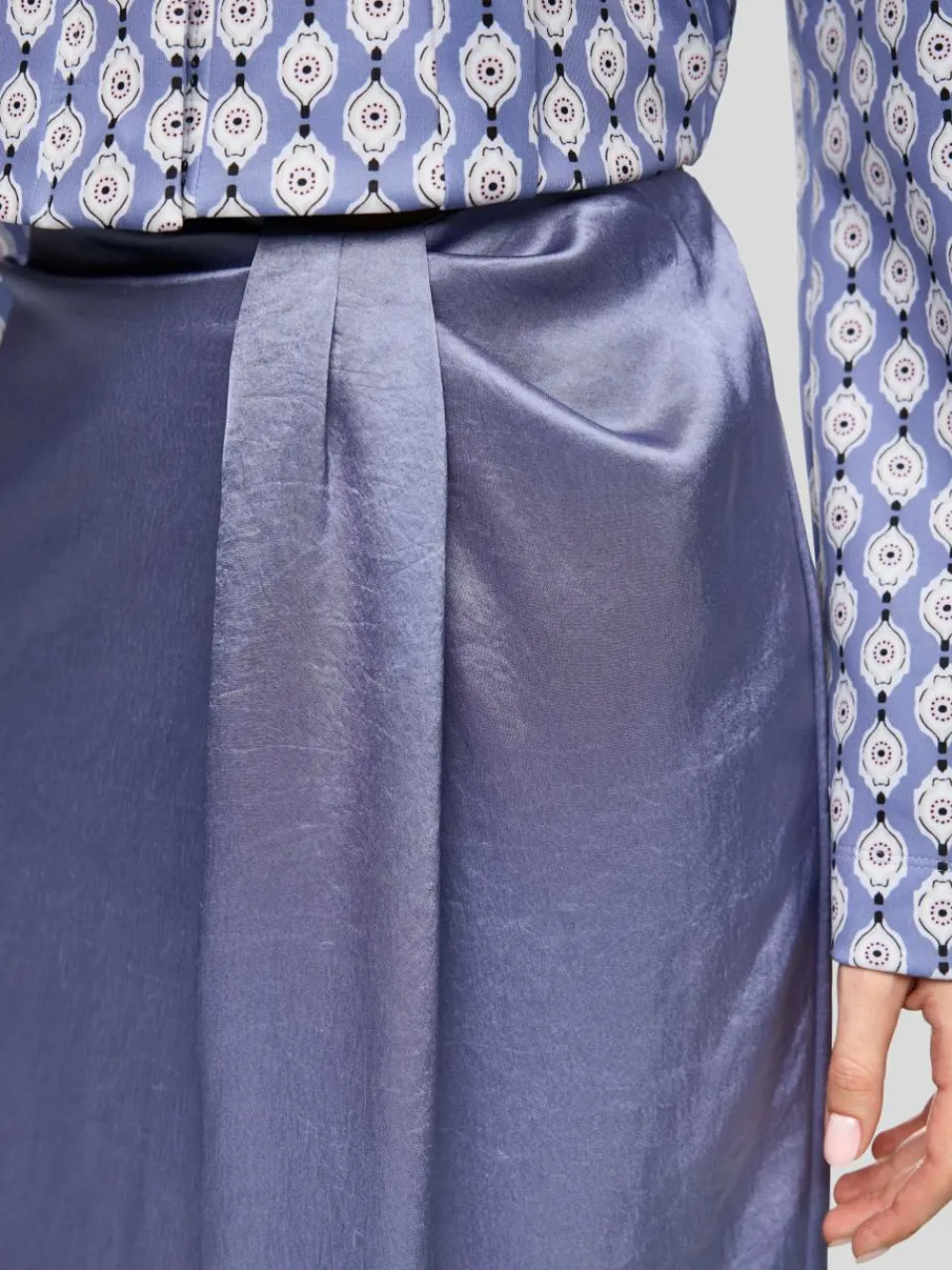 Der Rock in Maxi-Länge präsentiert sich in einem edlen, fließenden Stoff mit einem sanften Glanz. Die figurbetonte, gerade Schnittführung wird durch eine raffinierte Drapierung an der Vorderseite ergänzt, die für eine elegante Silhouette sorgt. Geschlossen wird der Rock an der Rückseite mit einem Nahtverdecktem Reißverschluss und Knopf, zudem verfügt er über einen Schlitz, um das Laufen zu erleichtern.