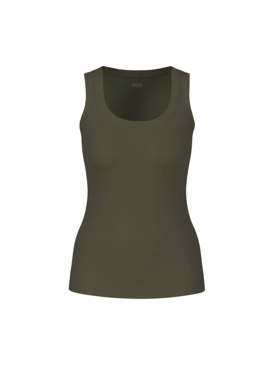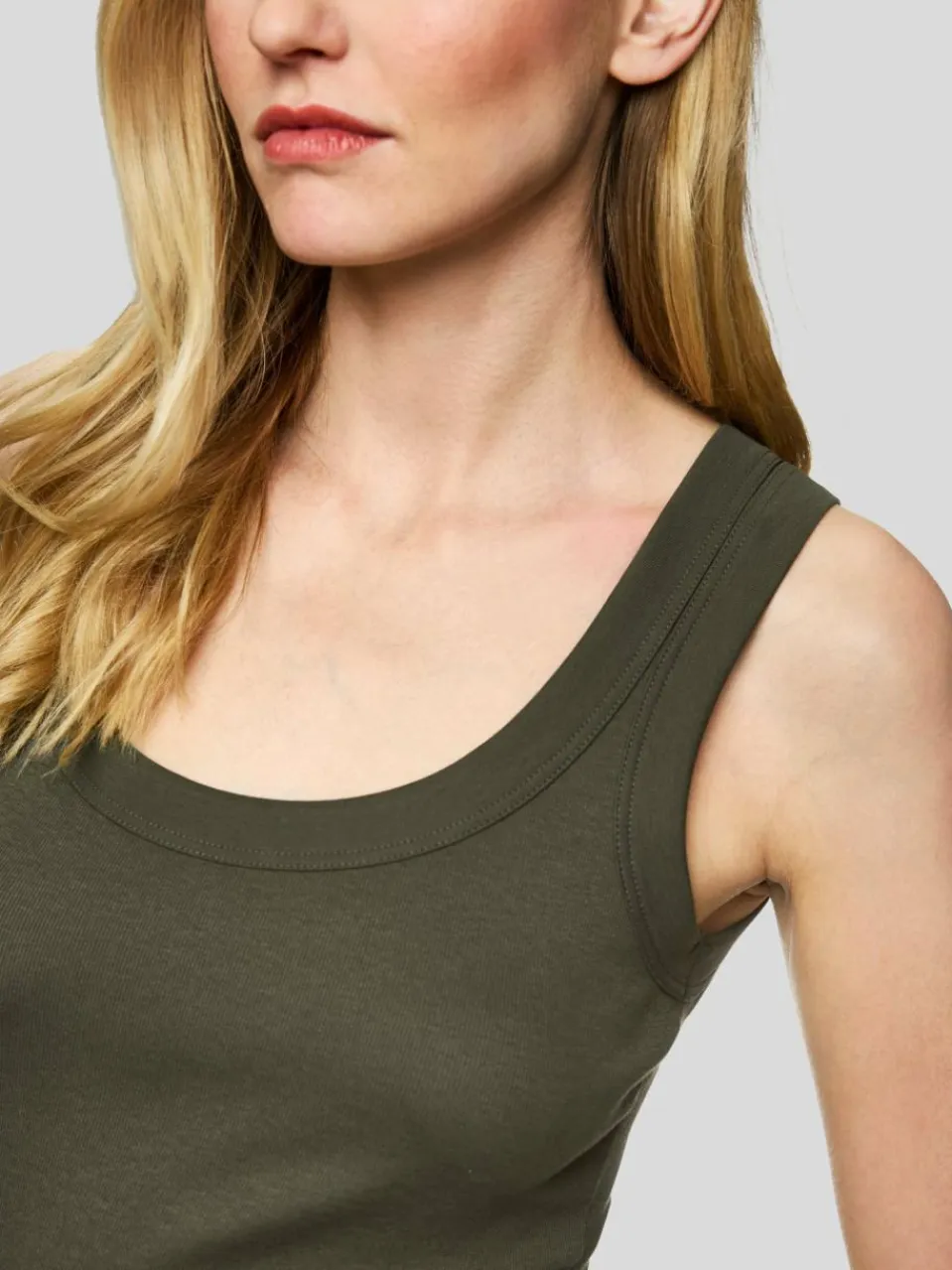 Das ärmellose Top ist aus softem und flexiblem Baumwollripp. Es ist körpernah geschnitten und hat markante Einfassungen an Dekolletee und Armausschnitten. In seiner minimalistischen Art ist es ein perfektes Basic.
