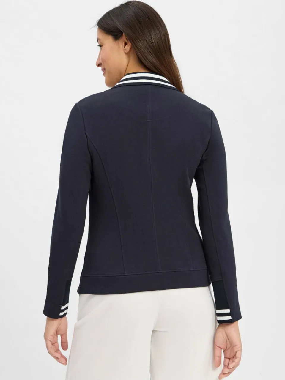 Der Marc Cain Sports Blazer kombiniert sportive und feminine Elemente auf schönste Weise – Ripp-Details treffen auf eine weiche Sweat-Qualität und antaillierte Passform.