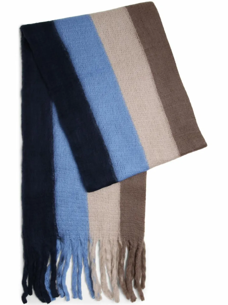Schlichte Basic-Looks erhalten mit dem Marie Lund Schal einen trendbewussten Blickfang – Streifen treffen auf Fransen.