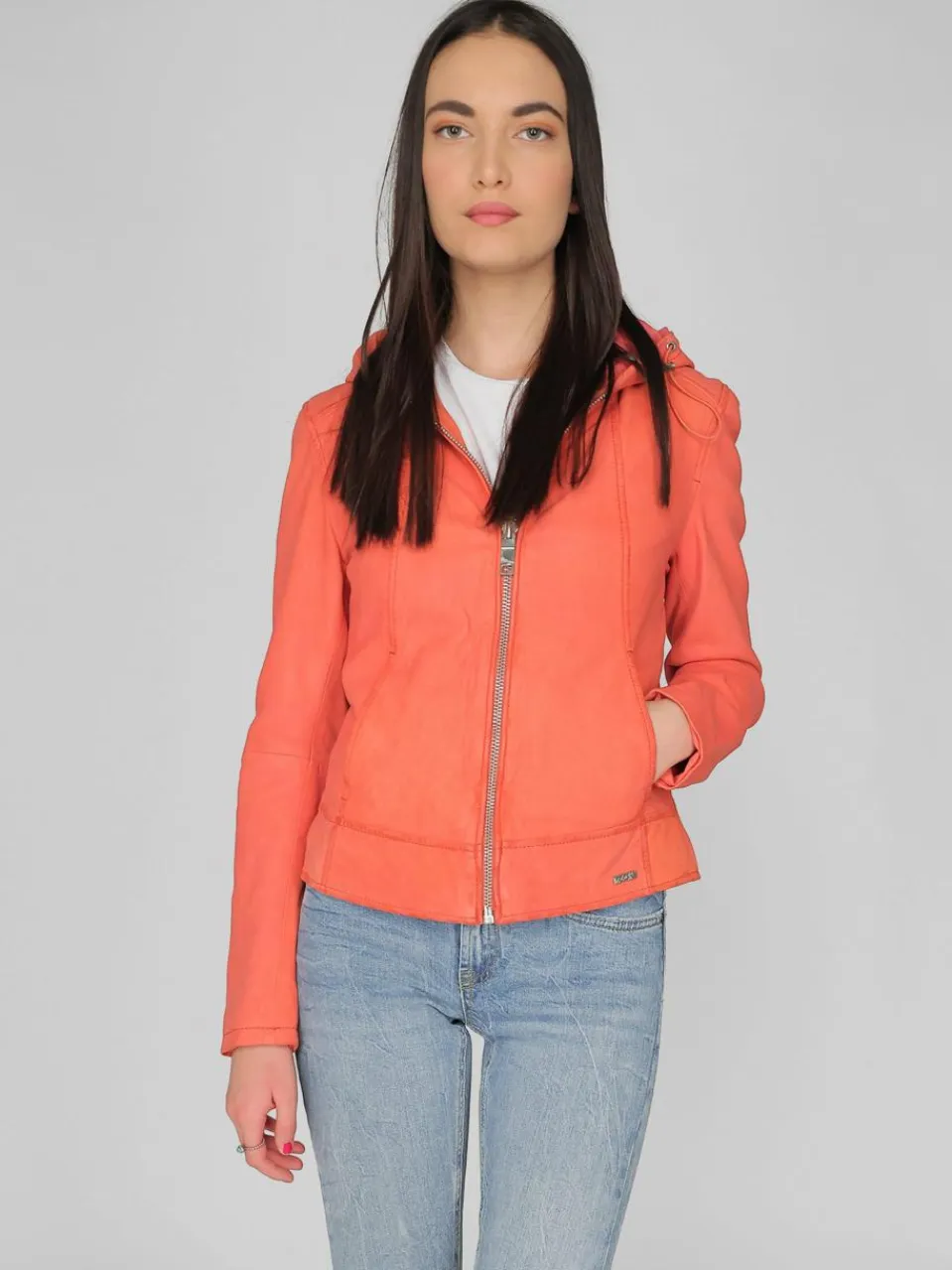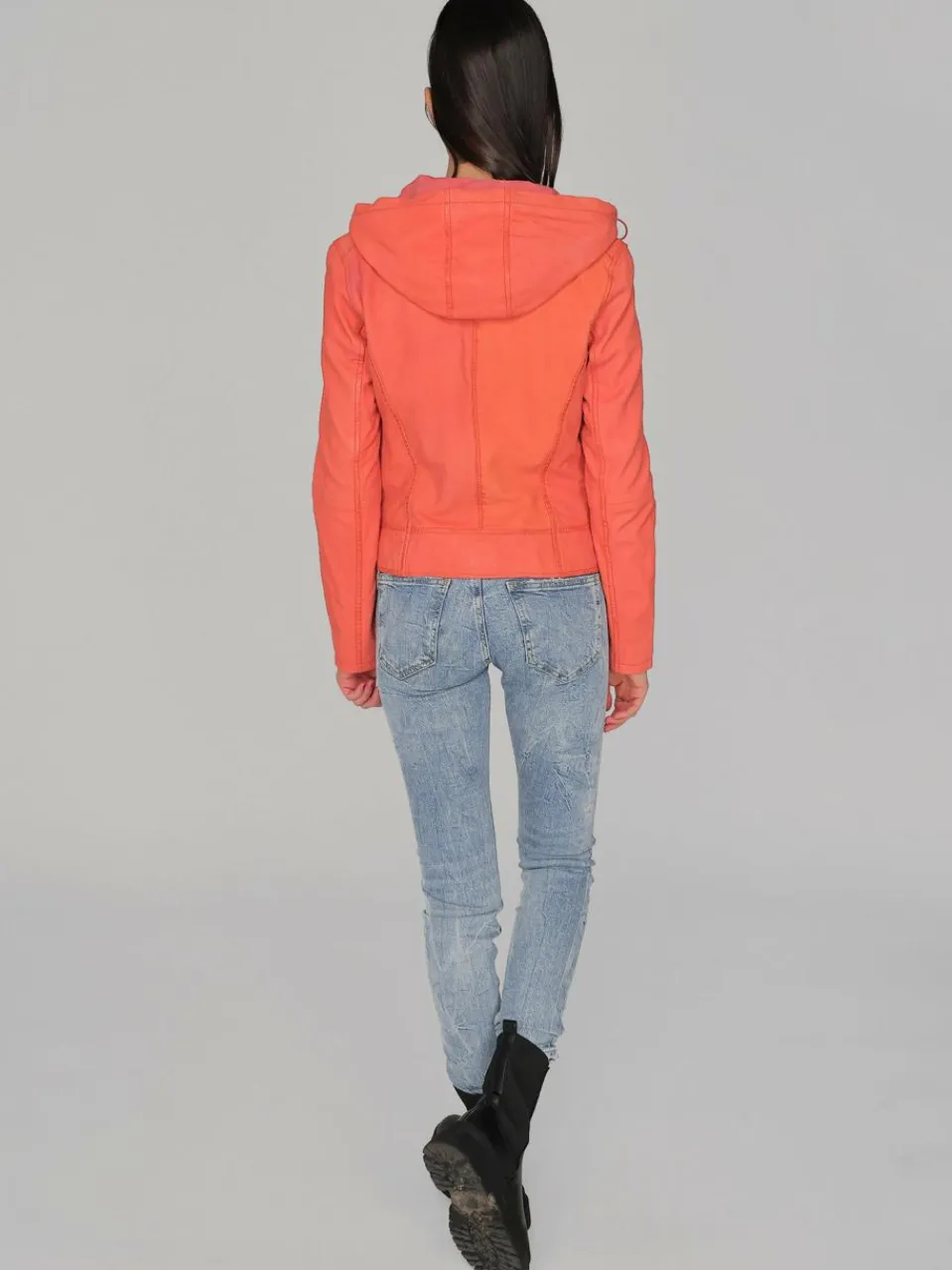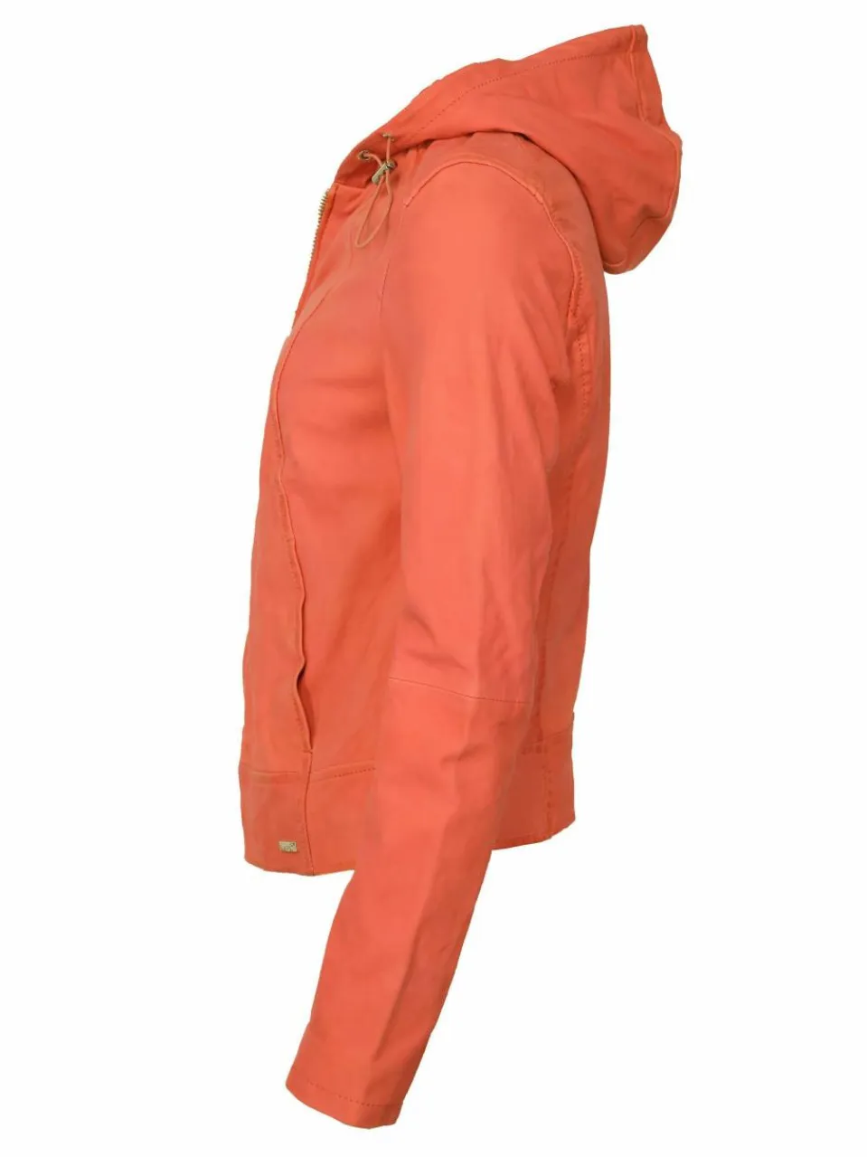 Moderne Damenlederjacke der Modemarke Maze. Die Jacke verfügt über zwei Seitentaschen mit Druckknöpfen und eine Innentasche. Die Jacke wird über einen geraden Reißverschluss geschlossen und besitzt zudem eine schöne Kapuze mit Gummizug auf beiden Seiten. Das feine Innenfutter rundet die hochwertige verarbeitete Lederjacke ab. Die Lederjacke ist einfach und mit schönen Ziernähten gestaltet.