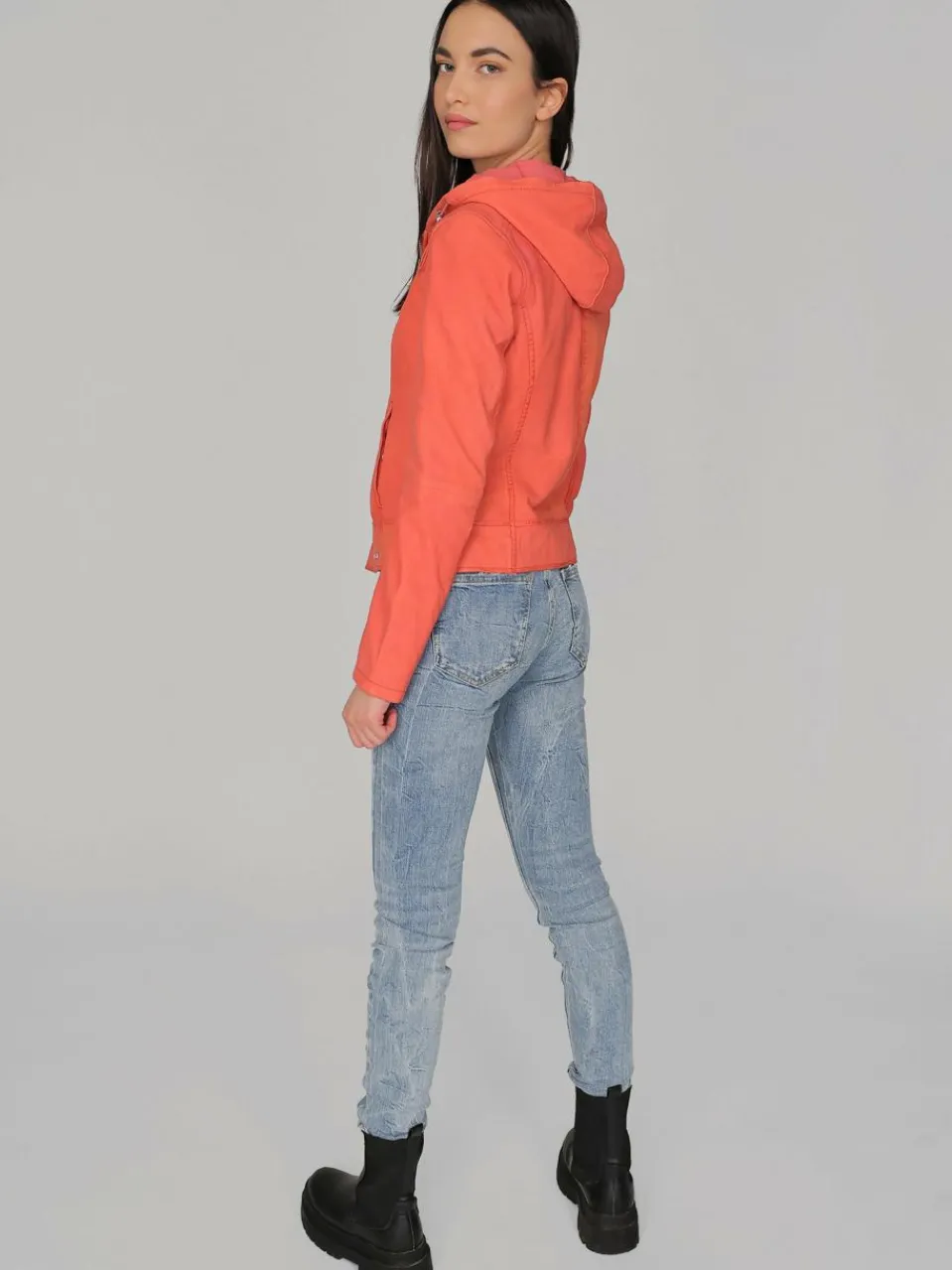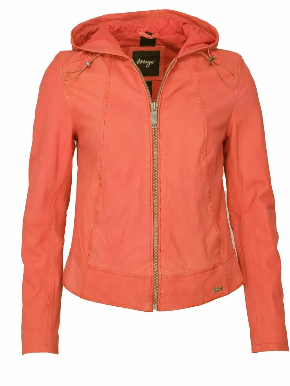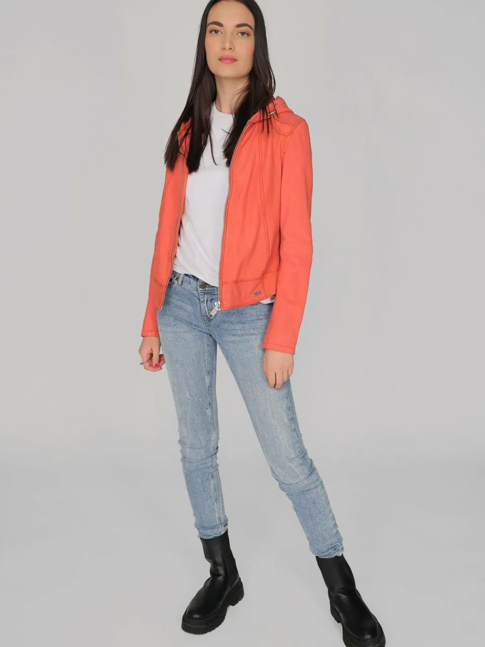 Moderne Damenlederjacke der Modemarke Maze. Die Jacke verfügt über zwei Seitentaschen mit Druckknöpfen und eine Innentasche. Die Jacke wird über einen geraden Reißverschluss geschlossen und besitzt zudem eine schöne Kapuze mit Gummizug auf beiden Seiten. Das feine Innenfutter rundet die hochwertige verarbeitete Lederjacke ab. Die Lederjacke ist einfach und mit schönen Ziernähten gestaltet.