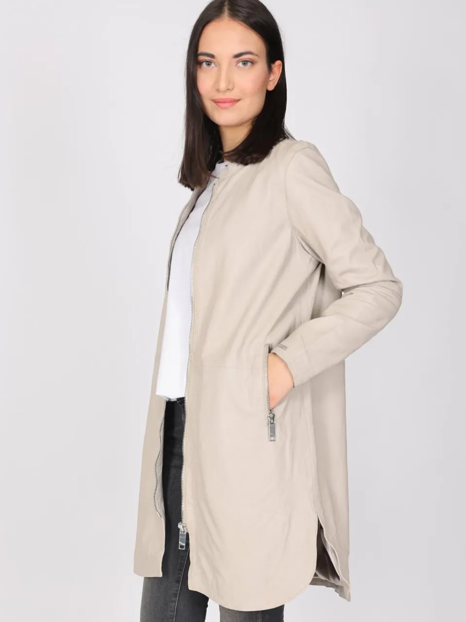 Ein absolutes ‚Must Have‘ – ist dieser stylische Ledermantel der Trendmarke Maze. Durch die silberfarbenen Zipper wird dieser geschmeidige Ledermantel zu Ihrem neuen Lieblingsstück. Dieser Mantel lässt sich gerade schließen und besitzt einen angenehmen und kurzen Stehkragen.