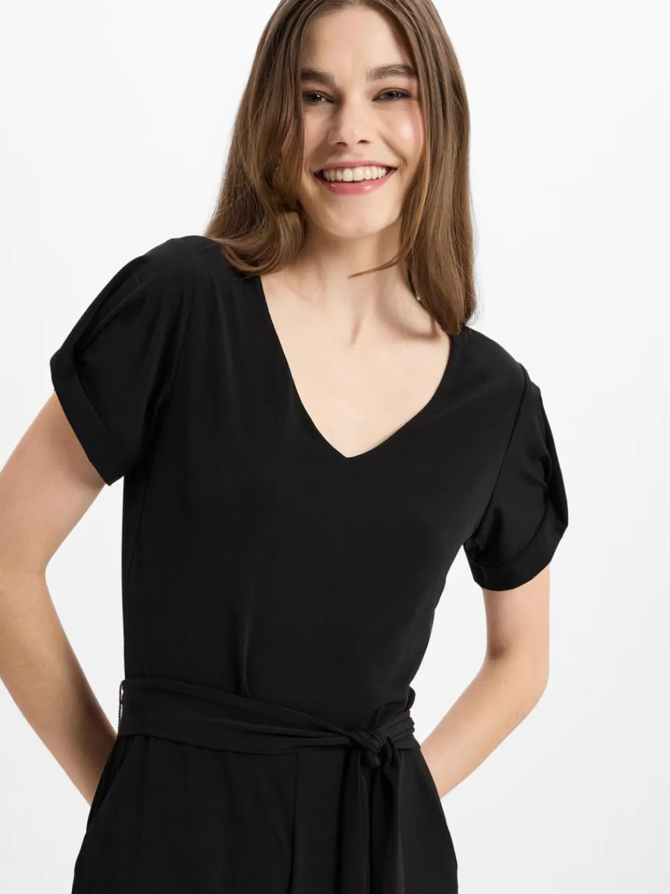 Klassisch-cool reiht sich der gecroppte Jumpsuit von More & More mit V-Ausschnitt und Taillenband in die Freizeitgarderobe ein.