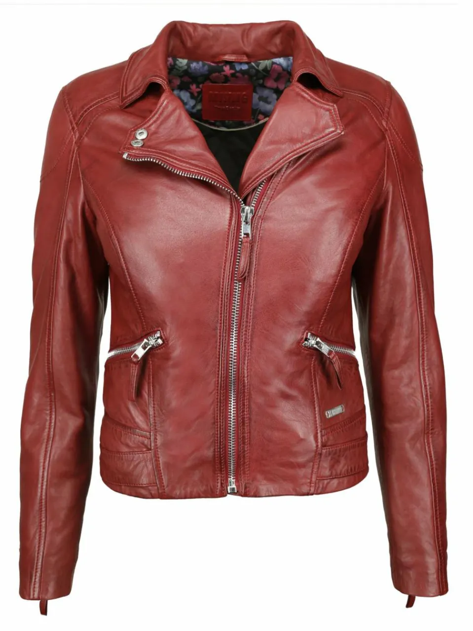 Trendige Damenlederjacke aus sanftem Lammleder der Marke MUSTANG. Die schräg eingenähten Seitentaschen mit Zipper und der schöne Hemdkragen mit Druckknöpfen machen diese Jacke zu einem besonderen Highlight. Die Passform der Jacke kann durch die Reißverschlüsse an den Ärmelenden und mit den Schnallen an den unteren Seiten angepasst werden. Die Jacke besitzt sehr schöne Ziernähte und ist mit zwei Innentaschen ausgestattet. Das gewisse Etwas erhält Sie durch das Blumeninnenfutter.