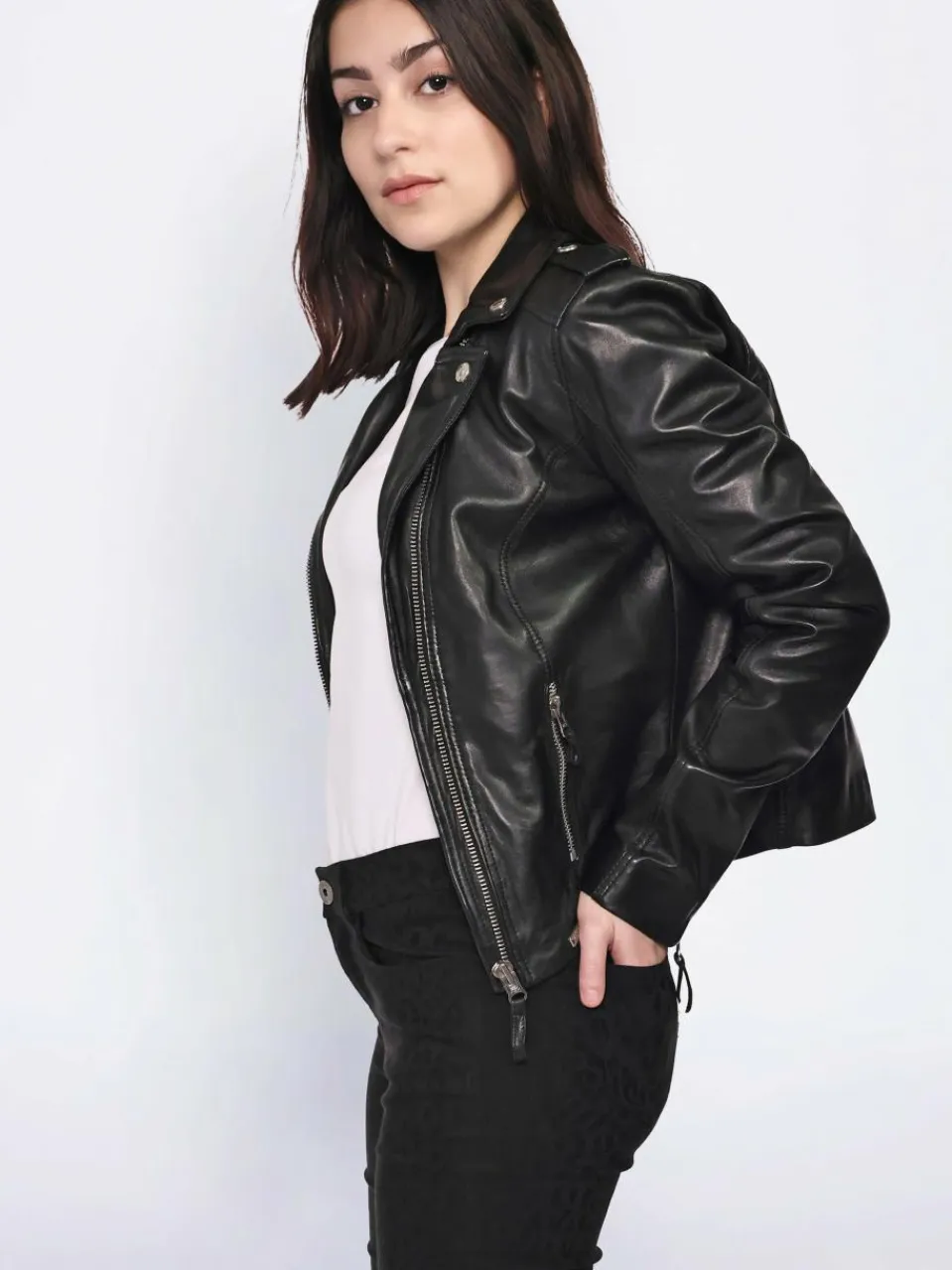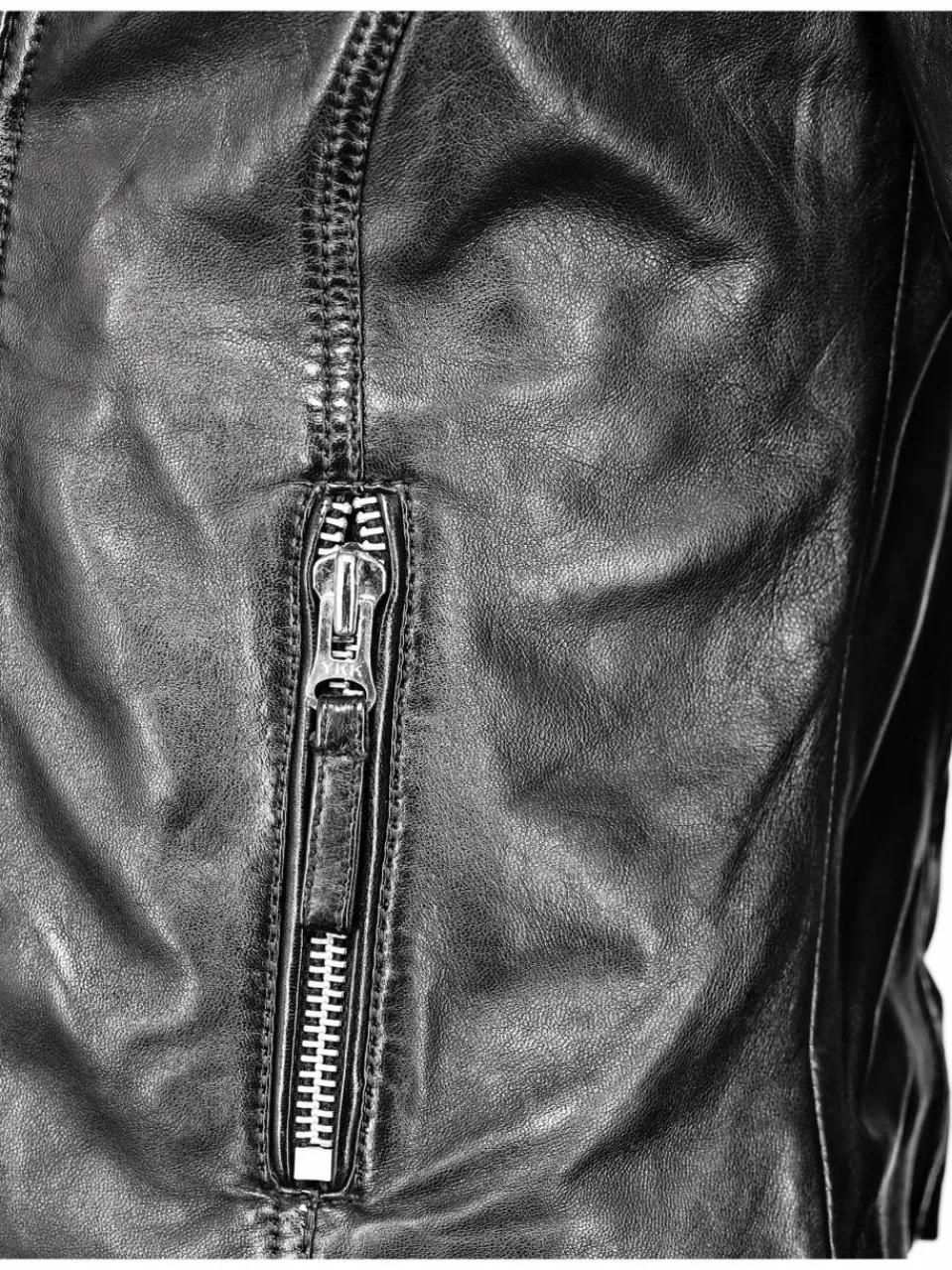 Trendige Damen Lederjacke aus weichem Lammleder der Marke Mustang. Die zwei eingearbeiteten Seitentaschen mit Zipper, der schöne Reverskragen und die Brusttasche mit Zipper machen diese Jacke zu einem besonderen Highlight. Die Jacke besitzt zusätzlich zwei Innentaschen und einen asymmetrischen Reißverschluss. Sie ist körpernah geschnitten. Der Schnitt der Jacke in Kombination mit dem weichen Innenfutter sorgt für einen fantastischen Tragekomfort.