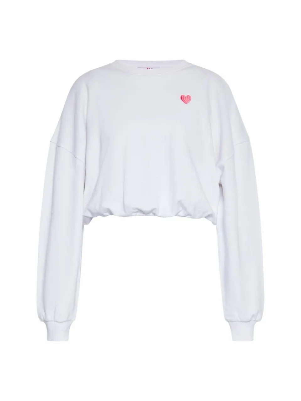 This cropped sweatshirt is a stylish addition to your wardrobe. Featuring a round neckline with ribbed trim, it offers a relaxed fit with a drop shoulder design for comfort. The elasticated hem creates a gathered effect at the waist, while an embroidered heart on the chest adds a touch of charm. Long sleeves with ribbed cuffs ensure a comfortable fit, providing a casual look ideal for everyday wear.
