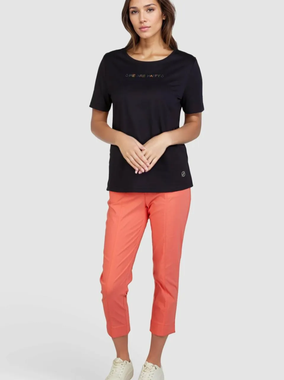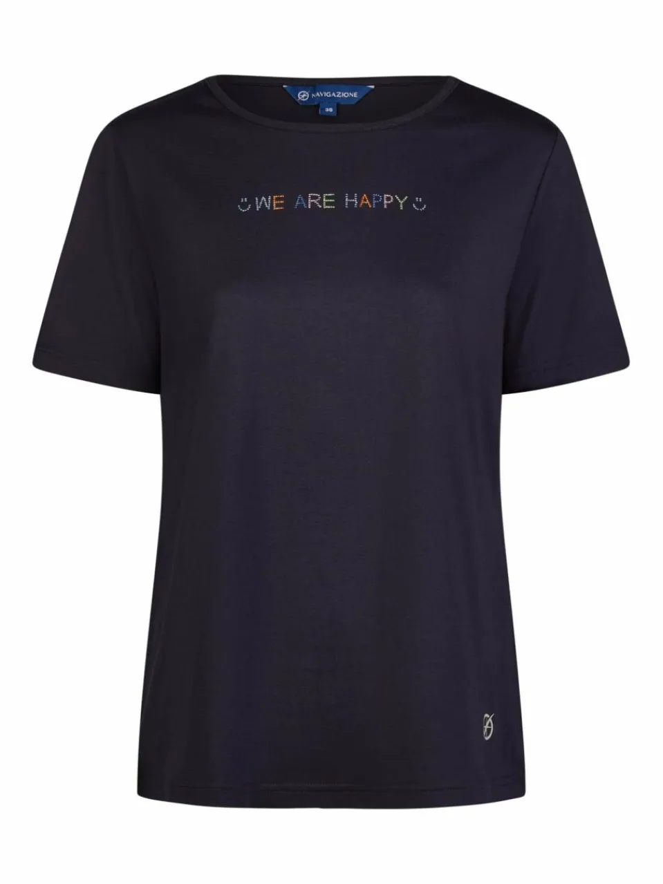 Dieses trendige Damen-Shirt kombiniert lässigen Stil mit funkelnden Details. Das bunte Lettering „WE ARE HAPPY“ auf der Vorderseite ist mit Strasssteinen verziert und verleiht dem Shirt einen fröhlichen, stylischen Akzent. Der klassische Rundhalsausschnitt und der bequeme 1/2 Arm machen es ideal für den Alltag. Dank der hochwertigen Materialmischung aus 50% Baumwolle und 50% Modal fühlt sich das Shirt angenehm weich auf der Haut an und bietet besten Tragekomfort.