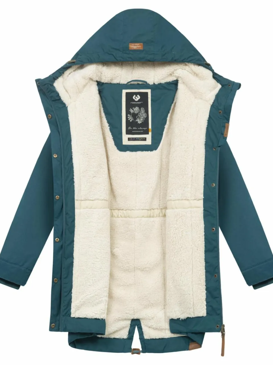 Stylischer gefütterter Damen Mantel mit Kapuze, weichem Innenfutter aus Teddyfell und dicken Tunnelzugkordeln für die kalte Jahreszeit.
