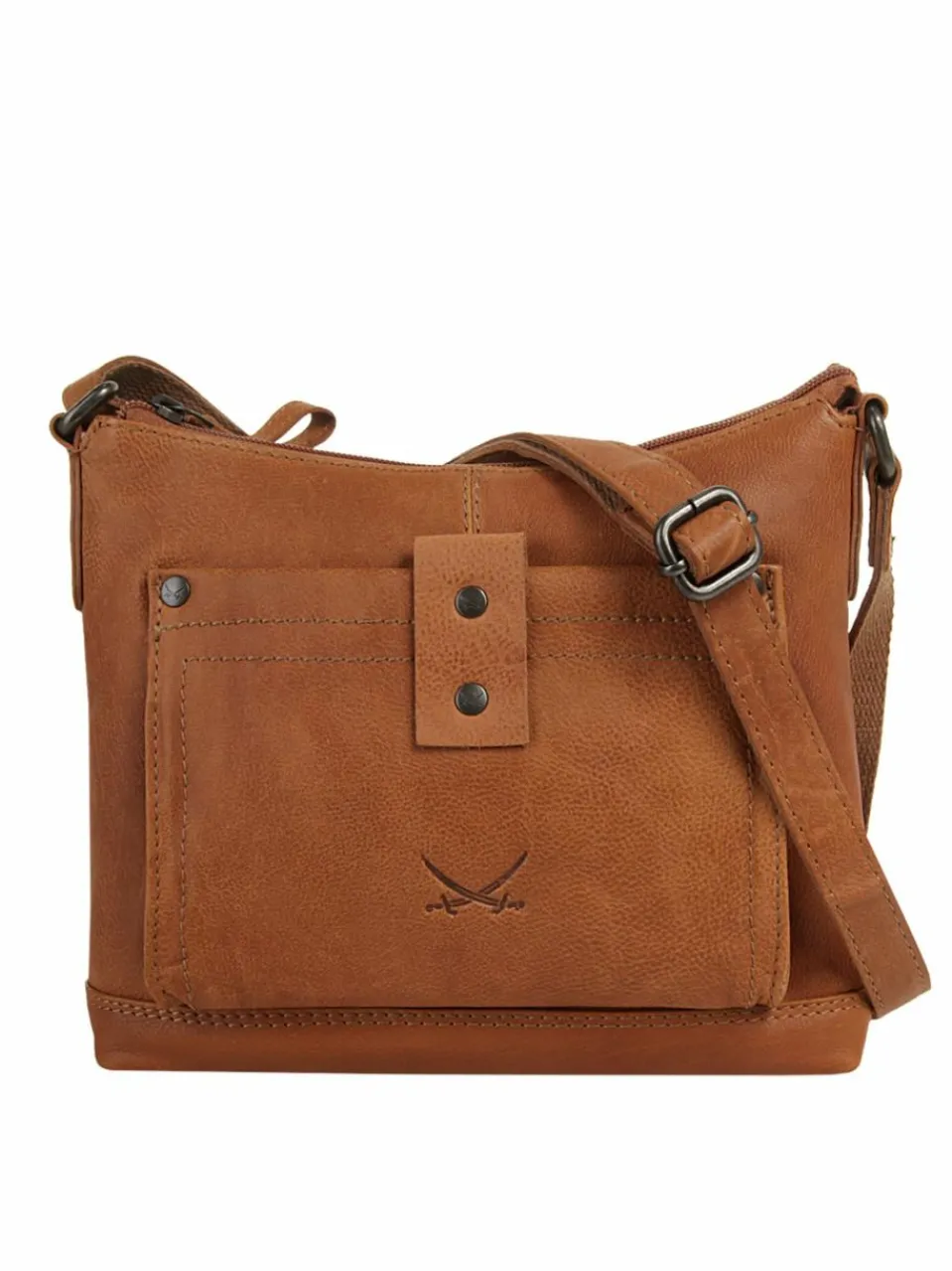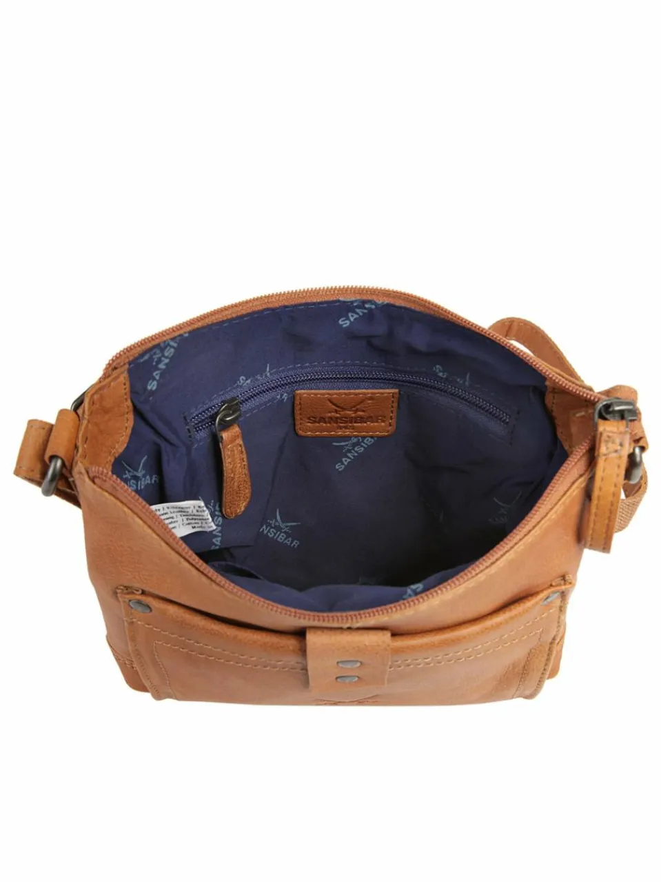 Lässige Leder Umhängetasche von Sansibar. Rustikale Sattlernähte und dezente Nietendetails ergänzen den Vintage Look des Leders. Das elastische Hauptfach lässt so einiges im Inneren verschwinden. Weitere Innen- und Außenfächer bieten zusätzlichen Stauraum. Mit einem Gewicht von nicht einmal 500 Gramm ist die Tasche wunderbar leicht. Das kultige Sansibar Logo, die zwei gekreuzten Säbel, ziert die Vordertasche sowie das Innenfutter.