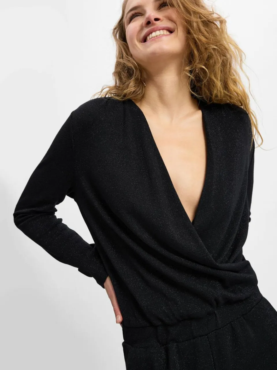 Mit seinem geraden Schnitt, dem eleganten Cache-Cœur-Ausschnitt und funkelndem Glitzergarn sorgt dieser Jumpsuit in hochwertiger Jerseyqualität für einen stilvollen, komfortablen Auftritt.