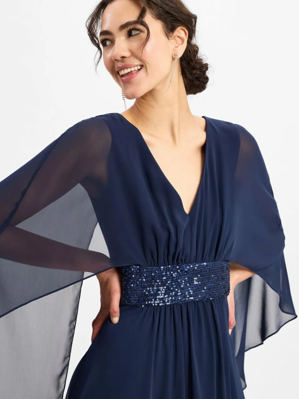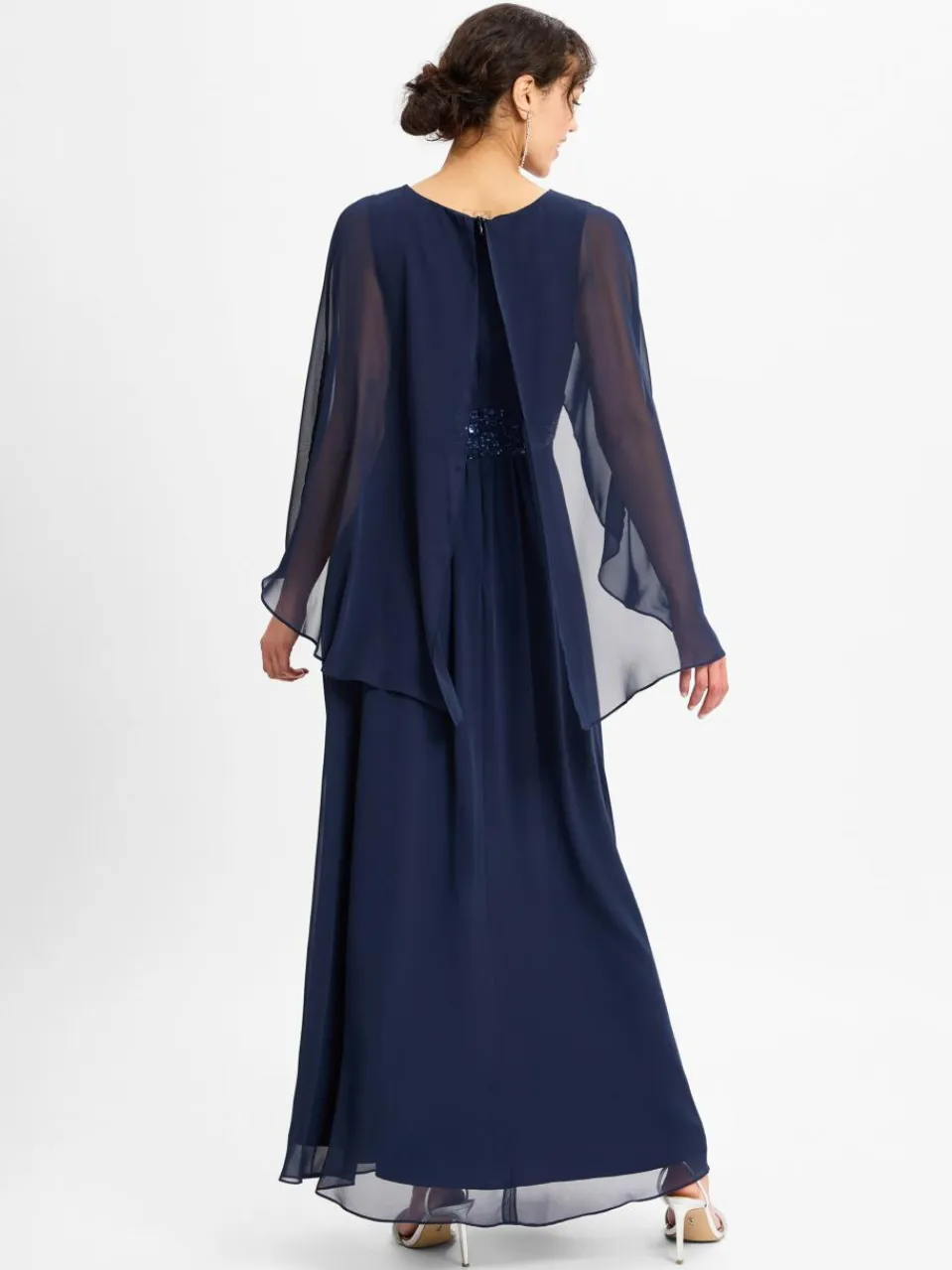 Das lange Kleid von Swing besticht durch den ausgestellten Rockteil mit Beinschlitz, das paillettenbesetzte Taillenband und nicht zuletzt durch die weiten, fließenden Ärmel im Cape-Design.