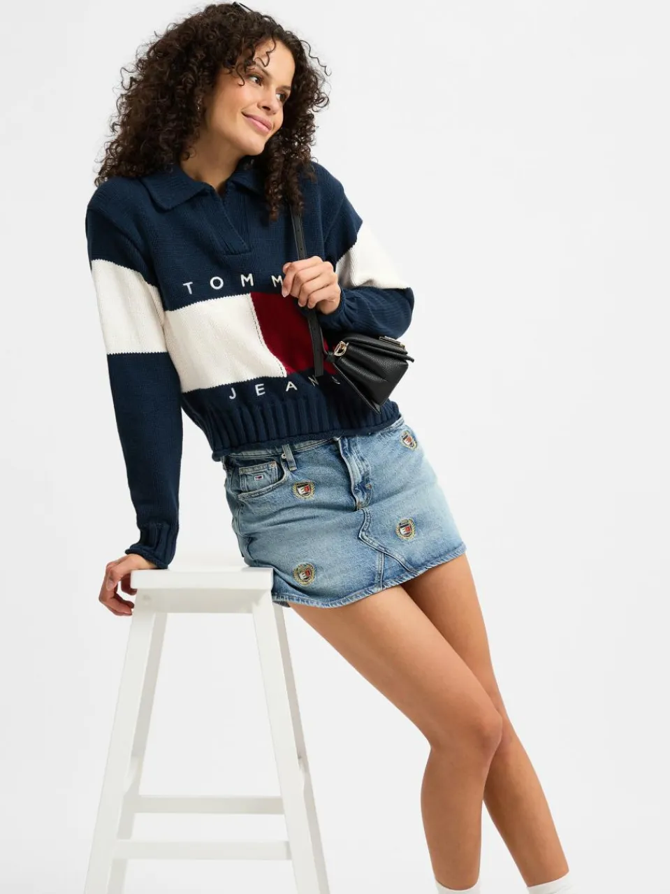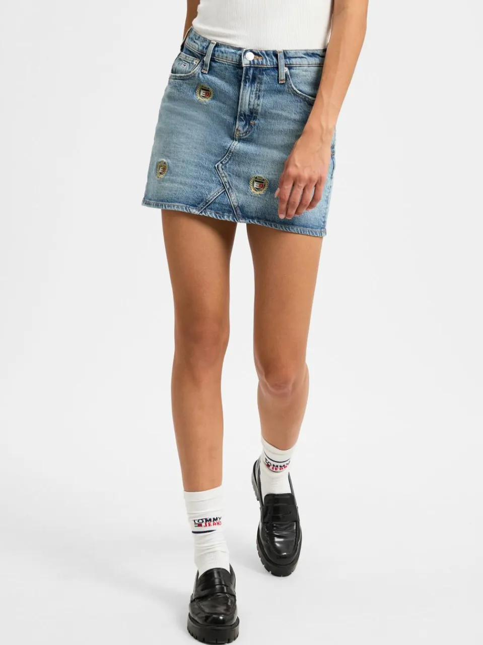 Der Jeansrock von Tommy Jeans mit stylischem Patches-Muster ist eine Inspiration für trendige Casual-Outfits.