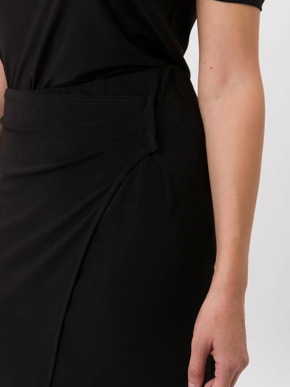 Ein Klassiker für zeitlos elegante Looks präsentiert sich hier in diesem schmal geschnittenen Rock. Er sitzt durch seine Stretchqualität und den Bund mit verdecktem Gummizug ausgesprochen bequem. Das unifarbene Design erhält von femininer Wickeloptik und kleinem Print einen raffinierten Anstrich. Ein Rock, der sich für viele Anlässe und Styling-Ideen bestens eignet.