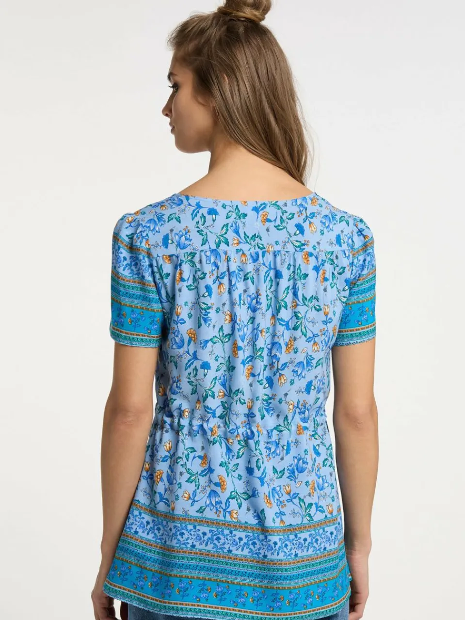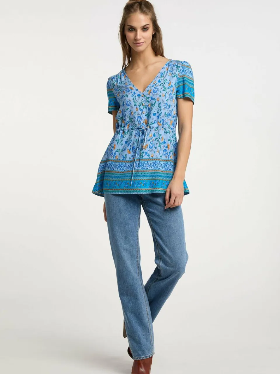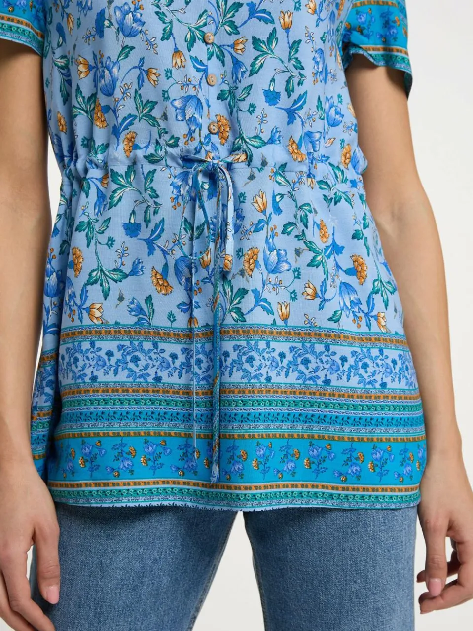 Romantisch-verspielt mit dem für usha FESTIVAL typischen Boho-Flair starten wir in den Sommer. Das aus leichter Viskose gefertigte Modell überzeugt mit seinem tiefen V-Ausschnitt, einem floralen Print und dem Bändchen-Tunnelzug für eine feminine Taillierung. Kleine Knöpfe und eine Bordürenoptik an Ärmeln und Saum verleiht dem Design einen aufgelockerten Twist.