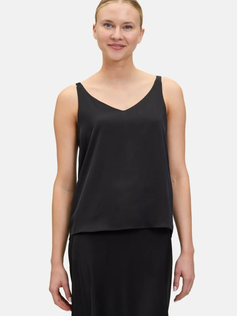 Chic und trendy! Die Satin-Bluse von Vera Mont wird sicherlich zu Ihren Highlight-Fashion-Pieces in Ihrem Kleiderschrank zählen! Die ärmellose Bluse mit V-Ausschnitt hat einen lässigen Schnitt, sorgt jedoch durch sein Feinmaterial Satin für einen elegante Look!