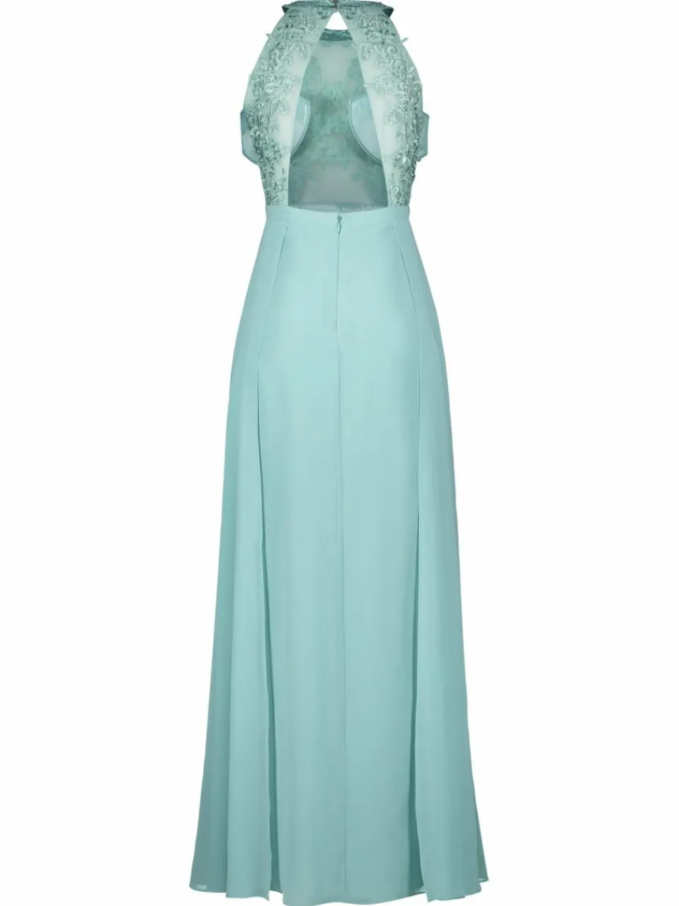Auf der Suche nach einem neuen Lieblings-Fashion-Piece? Dieses festliche Abendkleid kombiniert einen edlen Chiffon-Materialmix mit zarter Spitze und filigraner Stickerei. Der ausgestellte Schnitt und der hohe Schlitz sorgen für einen traumhaft eleganten Look, während der amerikanische Ausschnitt und der rückenfreie Stil feminine Akzente setzen. Ein Reißverschluss und eine zarte Knopfschlinge hinten runden das Design ab – perfekt für besondere Anlässe!
