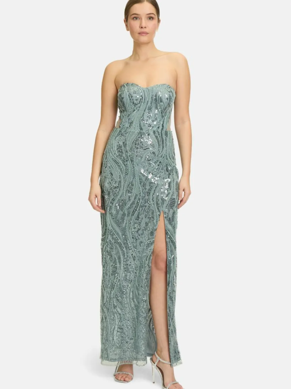 Dieses elegante Abendkleid in Maxi-Länge verleiht deinem Look eine glamouröse Ausstrahlung. Das ärmellose Design und der herzförmige Ausschnitt setzen deinen Oberkörper stilvoll in Szene. Die figurbetonte Passform betont deine Silhouette, während die modernen Cut-Outs an den Seiten für einen aufregenden Akzent sorgen. Der unifarbene Stoff und der Reißverschluss garantieren eine perfekte Passform und einen bequemen Sitz. Ideal für festliche Anlässe, strahlt dieses Kleid zeitlose Eleganz aus.