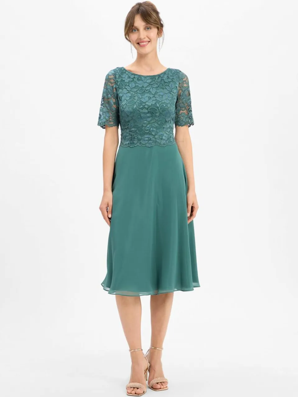 Das raffinierte Layering-Design und die Kombination aus romantischer Spitze und elegantem Chiffon definieren den Chic des Vera Mont Abendkleids.