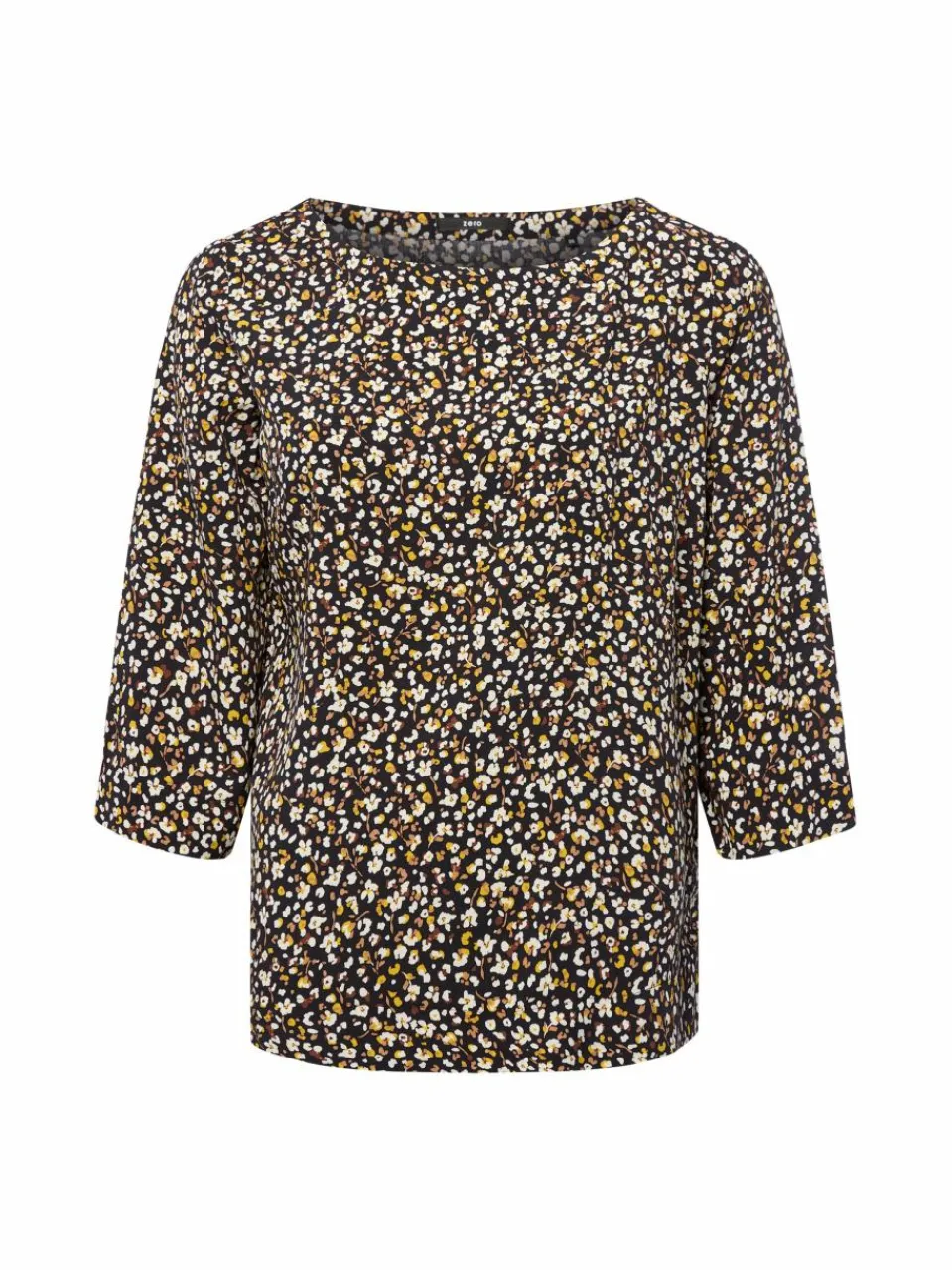 Verleiht dem Look ein verspieltes Finish: das zero Blusenshirt aus reiner Viskose mit 3/4-Ärmeln und abstraktem Millefleurs-Muster.