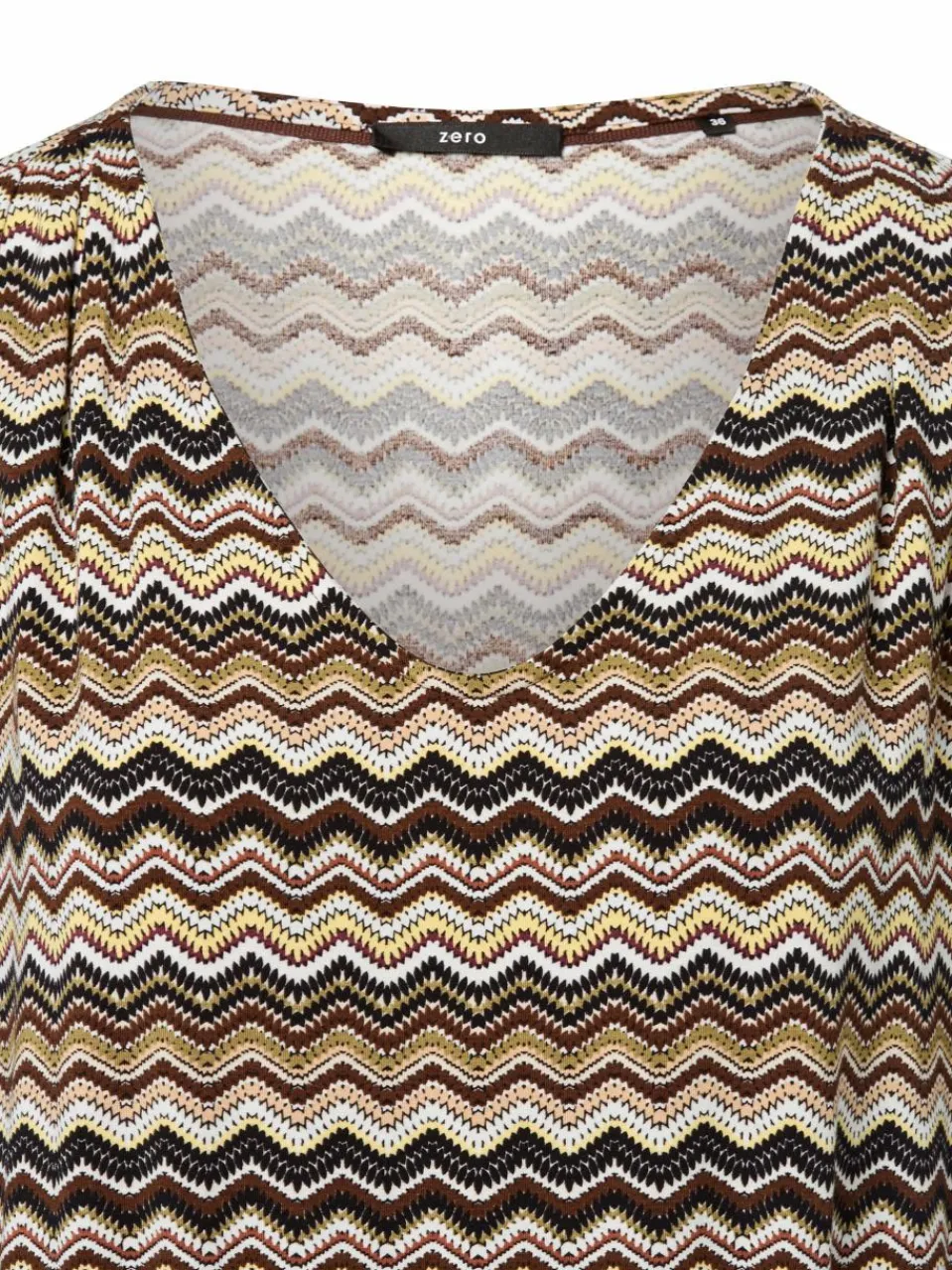 Das gemusterte und mit Liegefalten verzierte zero Shirt aus Viskose-Stretch ist ein Allrounder, der in Kombination mit monochromen Styles besonders gut zur Geltung kommt.