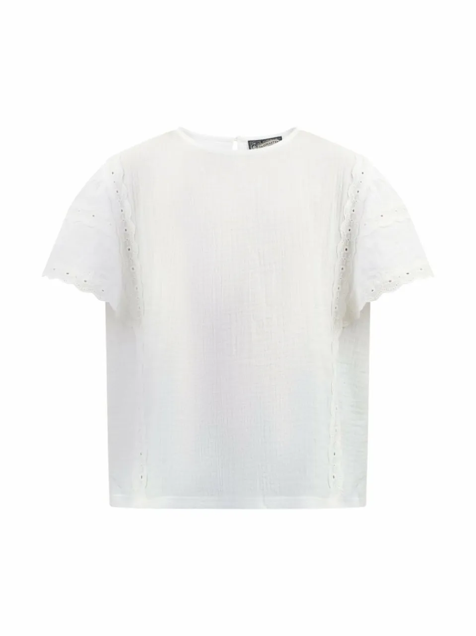 Aus einem dezent strukturierten Baumwollgemisch ist diese entzückende weiße Mädchenbluse von DreiMaster gefertigt. Ihre weiten Flügelärmel sind mit einer floralen Spitze verziert, was der Bluse einen romantischen Touch verleiht. Der klassische Rundhals wird mit Nacken mit einem Knopf verschlossen.