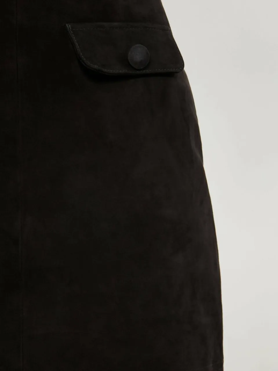 Dieser hoch taillierte, gerade geschnittene Rock endet oberhalb des Knies und strahlt Raffinesse aus. Die glatte Vorderseite und die aufgesetzten Taschen mit Knöpfen verleihen ihm eine elegante Note. Aus weichem Material in Wildlederoptik gefertigt, das eine strukturierte Oberfläche bietet, kombiniert er Struktur und Flexibilität in der Passform. Mit sauberem Saum und verdecktem Verschluss ist dieser Rock perfekt für alle, die einen gepflegten und dennoch vielseitigen Look suchen.