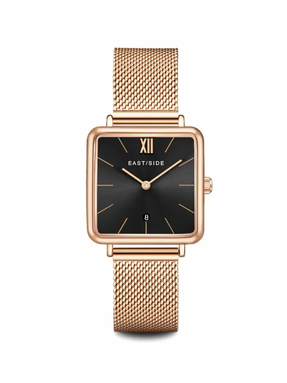 Wer gerne Ecken und Kanten zeigt, wird diese Damenuhr des Labels Eastside lieben! Edgy, urban und doch elegant-zeitlos greift sie das Lebensgefühl des New Yorker Stadtviertels Eastside auf. Eyecatcher ist das quadratische, IP-beschichtete Gehäuse, das dem Zeitmesser seinen markanten Charakter verleiht. Dezente Strichindices und Obélisque-Zeiger betonen das puristische Designkonzept, abgerundet durch ein stilvolles IP-vergoldetes Milanaise-Edelstahlarmband in Rosegold.