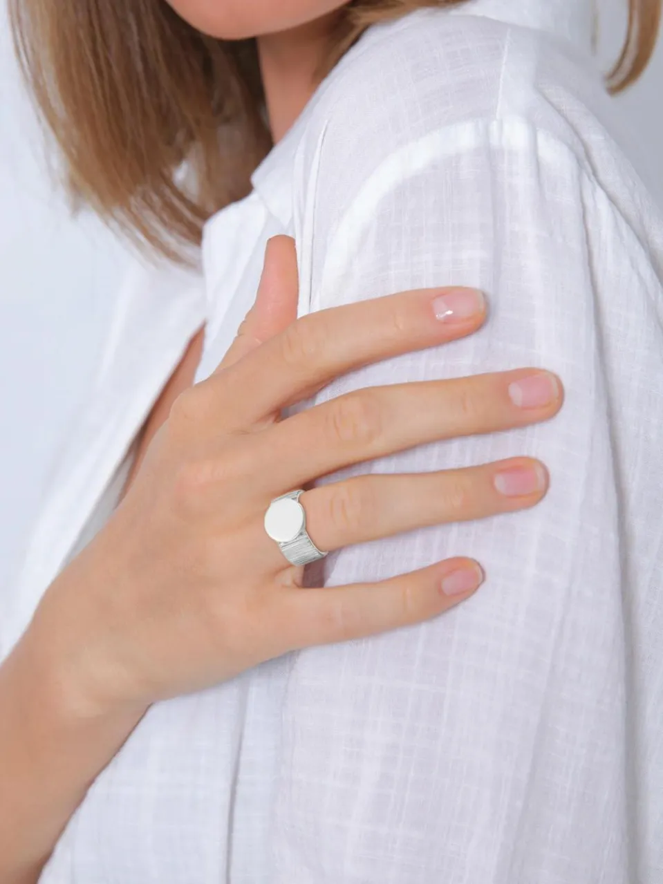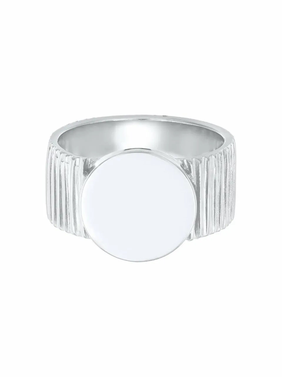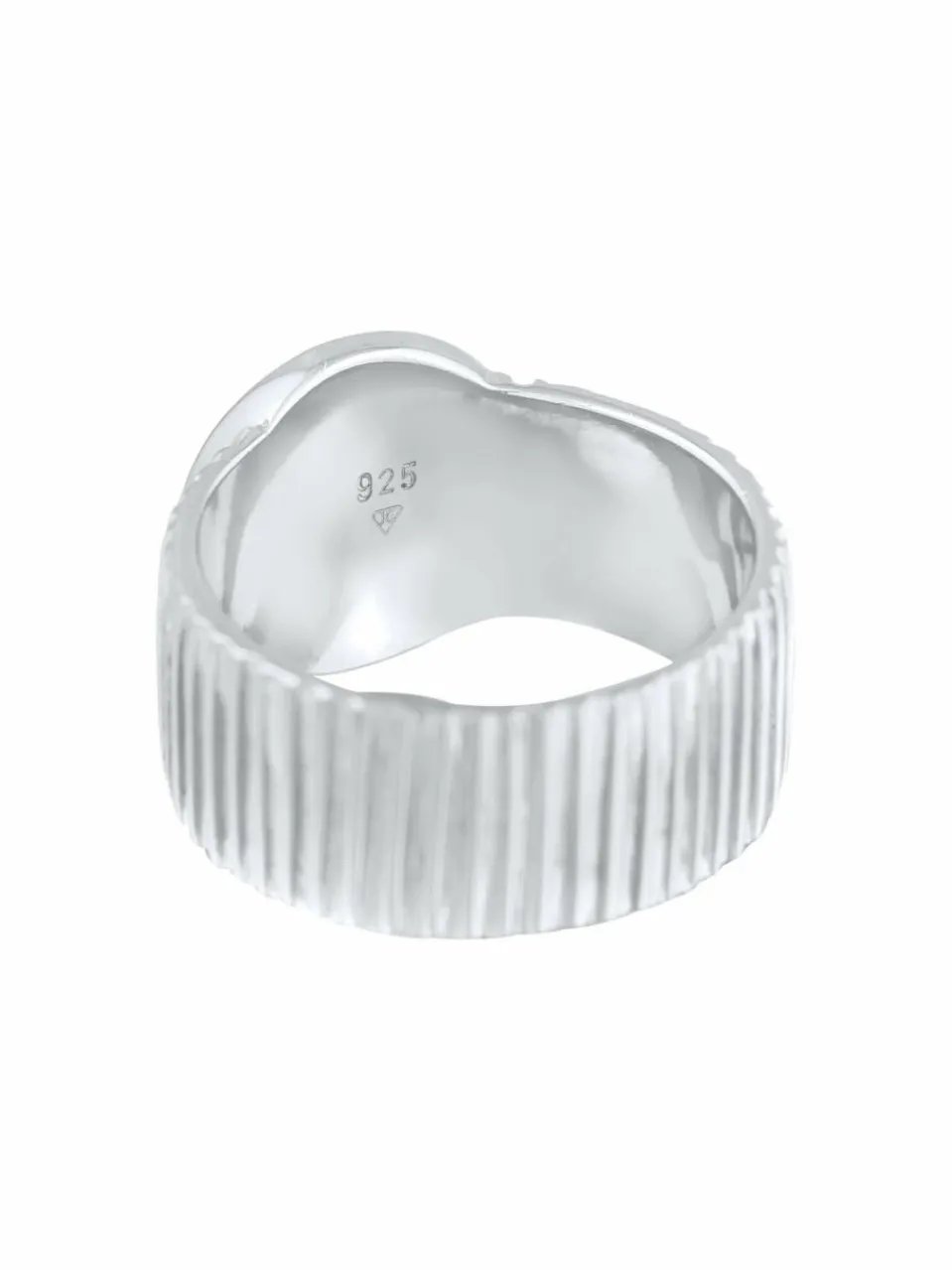 Dieser breite, kunstvoll gefertigte Damen Ring, zieht die Blicke auf sich. Die bemerkenswerte Rillen Struktur der breiten Ringschiene legt sich harmonisch um den Finger. Als Eye-Catcher ist im runden Design eine Plättchen auf der Oberseite des Ringes eingearbeitet. Ein tolles Accessoire mit Siegelring Charakter für alle, die gern große und extravagante Schmuckstücke tragen.Der Damen Ring fällt kleiner aus. Wir empfehlen daher das Schmuckstück eine Nummer größer zu wählen. Dieses exklusive Schmuckstück ist ein Elli PREMIUM Produkt und wird in einer eleganten Geschenk-Box geliefert.