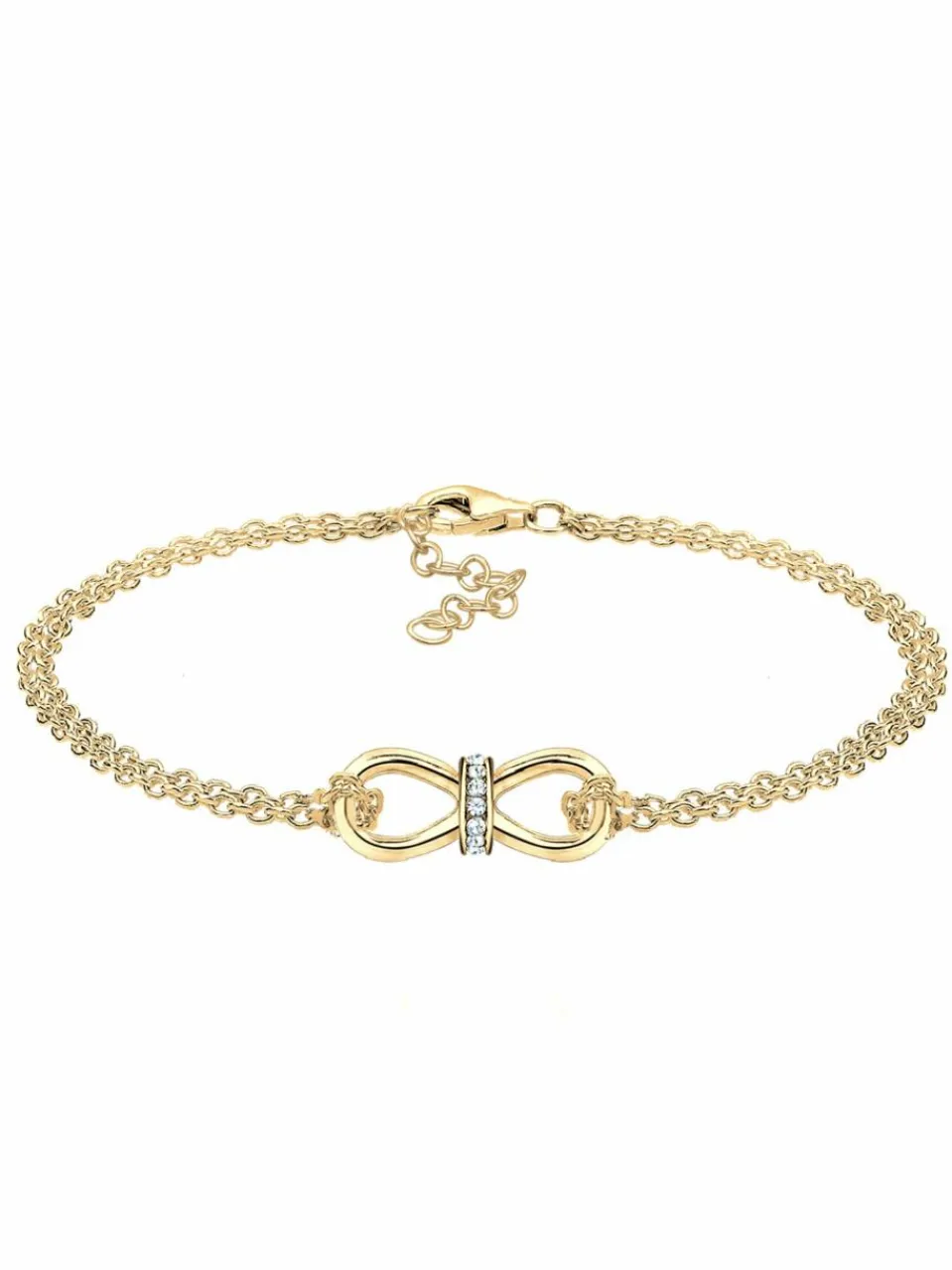 Warmes Gold trifft auf cooles Design: Dieses trendige Infinity-Armband wurde mit viel Liebe zum Detail aus vergoldetem 925er Sterling Silber gefertigt. Die 14 funkelnden Swarovski® Kristalle geben dem Armband ein leuchtendes Finish und bringen Ihre Trägerin zum Strahlen. Durch das besonderes und trendige Design ist der Armschmuck ein Must-have für alle die Design und Fashion lieben, und darf in keinem Schmuckkästchen fehlen.Dieses Armband ist in der Größe 16 cm und 18 cm erhältlich (+ 3 cm Verlängerung)