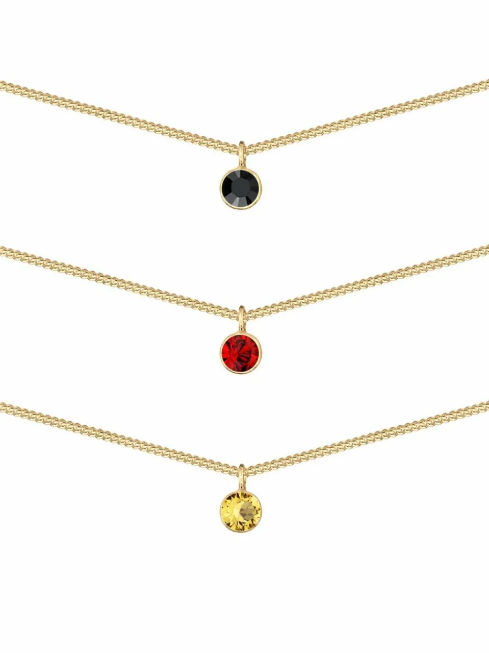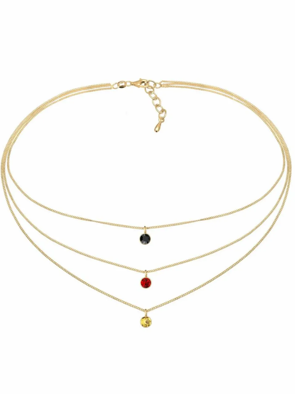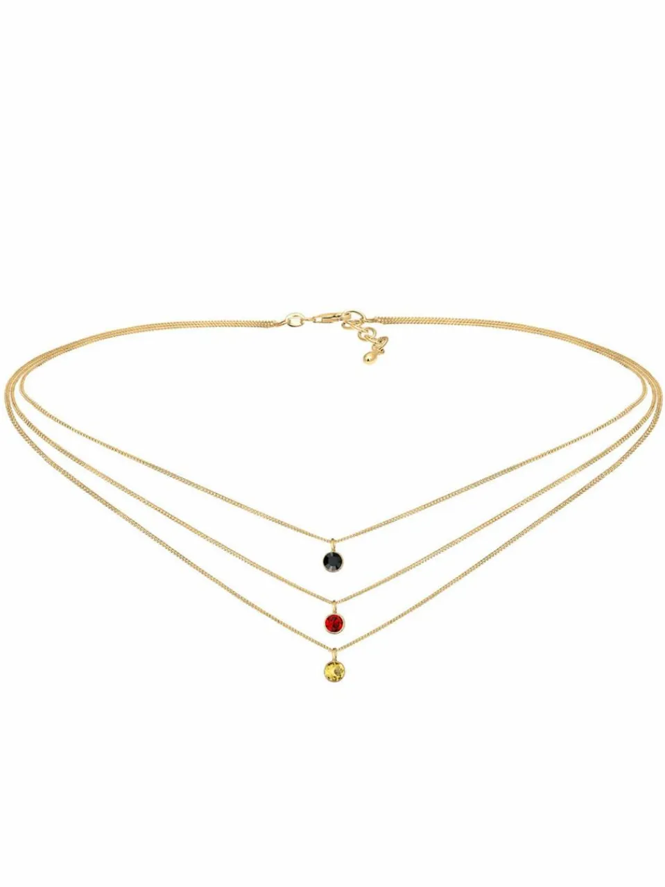 Dieses farbenfrohe Damen Schmuckstück gefertigt aus 3 Halsketten und drei Anhänger veredelt mit bunten Kristallen setzt sich in Szene. Die mehrreihige Choker Halskette lässt sich mit Hilfe eines Verlängerungskettchen schön auf die gewünschte Länge einstellen. Das funkelnde Accessoire komplettiert ihr Outfit mit Raffinesse.Choker-Ketten liegen besonders nah am Hals an und zurzeit topaktuell.Länge der oberen Halskette: ca. 34 cmLänge der mittleren Halskette: ca. 36 cm Länge der unteren Halskette: ca. 37.5 cm